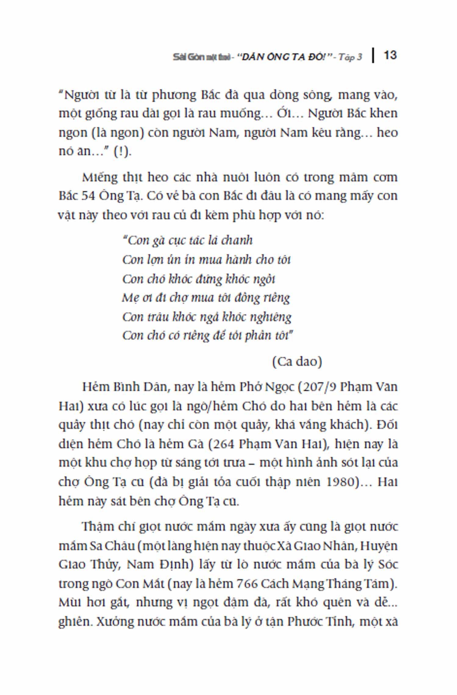 Khi đọc Sài Gòn một thuở: “Dân Ông Tạ đó!” tập 3, chúng ta cũng sẽ có cảm nhận tương tự. Tuy nhiên, lần này tác giả đã giới thiệu Ông Tạ theo một cách khác. Không phải bằng bản đồ, công trình kiến trúc, hay những con đường… mà bằng những thứ vô hình như mùi vị, cảm giác… Cù Mai Công đã khéo léo đưa chúng ta bước vào một thế giới khác, để chạm tới phần “hồn cốt” của cộng đồng những người Bắc 54, đặc biệt là cư dân vùng Ông Tạ.
