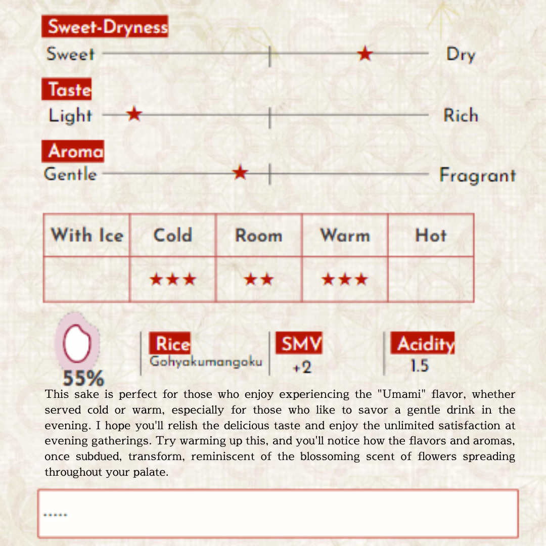 Sake Type: Light & Clean Độ cồn : 16 - 16.5% Mài gạo: 55% Gạo dùng: Gohyakumangoku SMV: +2 Độ axit: 1.5 Thành phần: gạo (sản xuất trong nước), men gạo koji (gạo sản xuất trong nước) NSX: xem trên nhãn (năm/tháng) HSD: theo thông lệ quốc tế không có HSD Hướng dẫn bảo quản: nơi khô ráo thoáng mát, tránh ánh nắng mặt trời. Thông tin cảnh báo: Trên 20 tuổi mới được phép dùng. Phụ nữ có thai hoặc cho con bú nên hạn chế sử dụng. Pháp luật nghiêm cấm lái xe sau khi uống. NK&PP: CÔNG TY TNHH STARMARK VIETNAM Xuất xứ: Nhật Bản