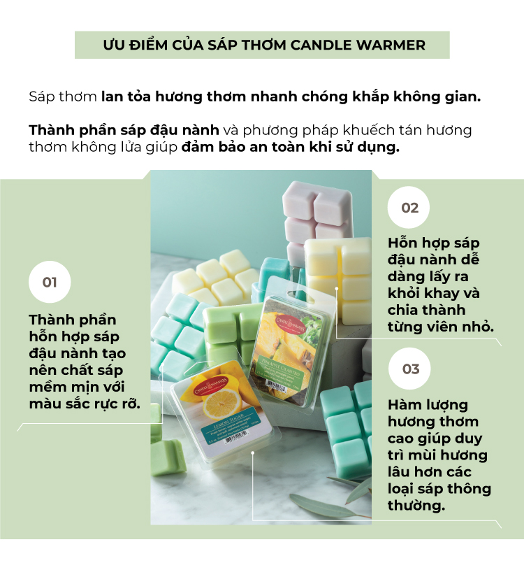 Hương thơm dịu nhẹ, thoáng mát, dễ chịuSáp thơm Aroma tạo hương thơm tự nhiên, nhẹ nhàng, mang đến cảm giác thoải mái, giúp nhanh chóng xóa tan mệt mỏi, đem lại cảm giác dễ chịu và