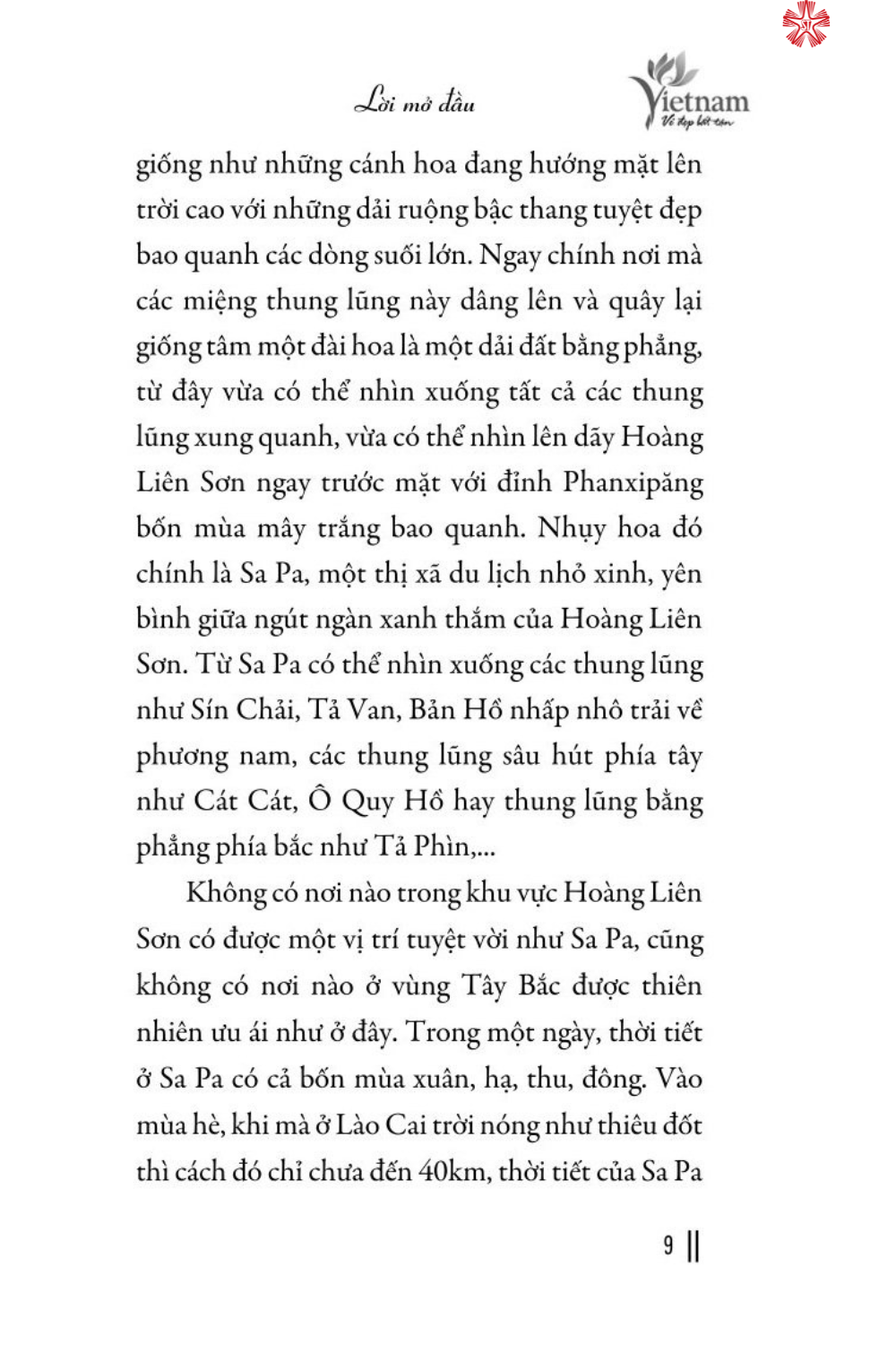 Là một thị xã của tỉnh Lào Cai, thuộc vùng Tây Bắc Bộ, Việt Nam, Sa Pa nằm ở độ cao 1.600m so với mực nước biển. Với diện tích khoảng 678,6km2, đây là nơi sinh sống chủ yếu của các dân tộc Mông, Dao, Tày, Giáy, Xá Phó, Kinh, Hoa. Sa Pa - vùng đất khiêm nhường, lặng lẽ nhưng ẩn chứa bao điều kỳ diệu của thiên nhiên. Nơi đây có khí hậu trong lành mát mẻ, đa dạng sắc thái. Thiên nhiên ưu ái ban tặng cho tiết