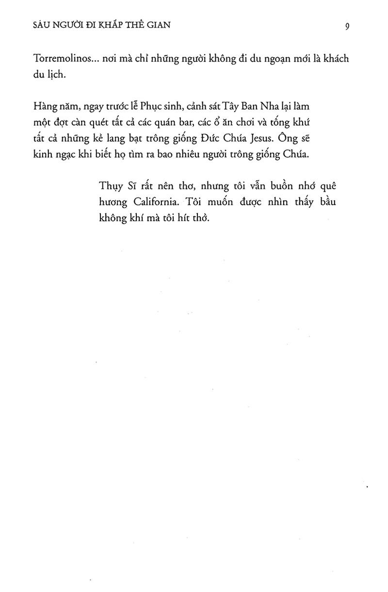 Như một bách khoa thư kết hợp nhuần nhuyễn s.úng ống và hoa hồng, tình yêu và tình dục, tôn giáo và nghệ thuật, du hành và túy, những bản ballad say lòng và tiếng kêu thầm xé ruột, có thể nói Sáu người đi khắp thế gian là một cuốn tiểu thuyết độc nhất vô nhị không bao giờ cũ về cuộc sống…