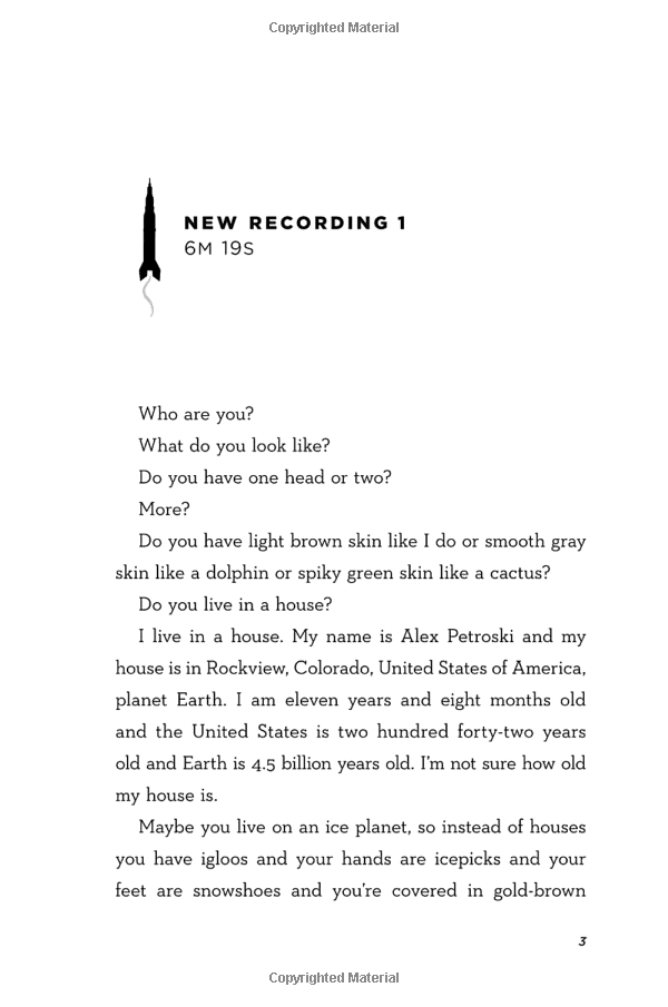 11-year-old Alex Petroski loves space and rockets, his mom, his brother, and his dog Carl Sagan--named for his hero, the real-life astronomer. All he wants is to launch his golden iPod into space the way Carl Sagan (the man, not the dog) launched his Golden Record on the Voyager spacecraft in 1977. From Colorado to New Mexico, Las Vegas to L.A., Alex records a journey on his iPod to show other lifeforms what life on earth, his earth, is like. But his destination keeps changing. And the funny, lost, remarkable people he meets along the way can only partially prepare him for the secrets he'll uncover--from the truth about his long-dead dad to the fact that, for a kid with a troubled mom and a mostly not-around brother, he has way more family than he ever knew.