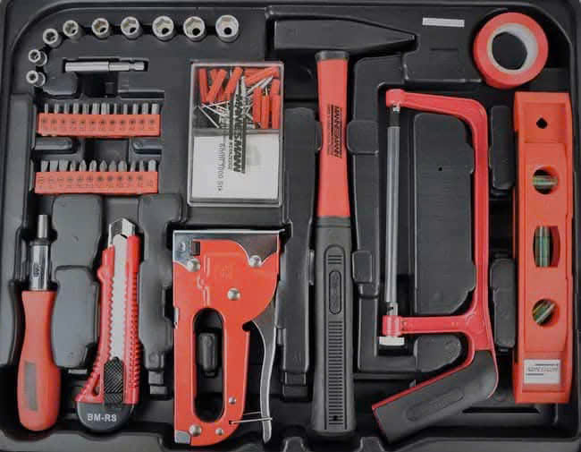 Bộ dụng cụ cầm tay 168 món Bao gồm: 1 búa nhổ đinh 8Oz 1 kìm kết hợp 7" 1 kìm mũi dài 6" 1 kìm bơm 10" 1 kìm tuốt dây 8,5" 1 tua