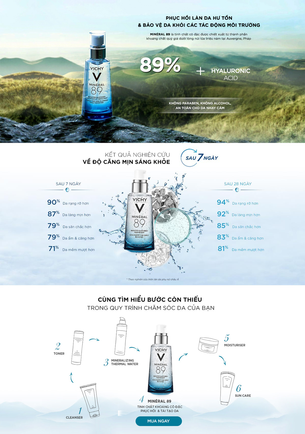 Cung cấp độ ẩm dài lâu vào sâu trong tế bào da, chứ không phải chỉ tức thời như xịt khoáng. Dưỡng chất khoáng cô đặc Vichy Mineral 89 làm dịu da, giúp da tươi trẻ mịn màng.