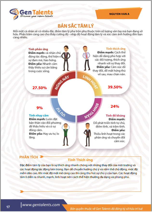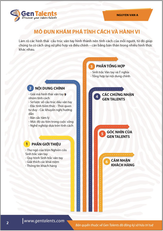 NỘI DUNG CHÍNH CỦA BÀI BÁO CÁO SINH TRẮC VÂN TAY GEN TALENTS – BẢN ĐẦY ĐỦ 4 MODULE: Phần 1: Khám phá tính cách & hành vi - Phân tích 9 nhóm tính