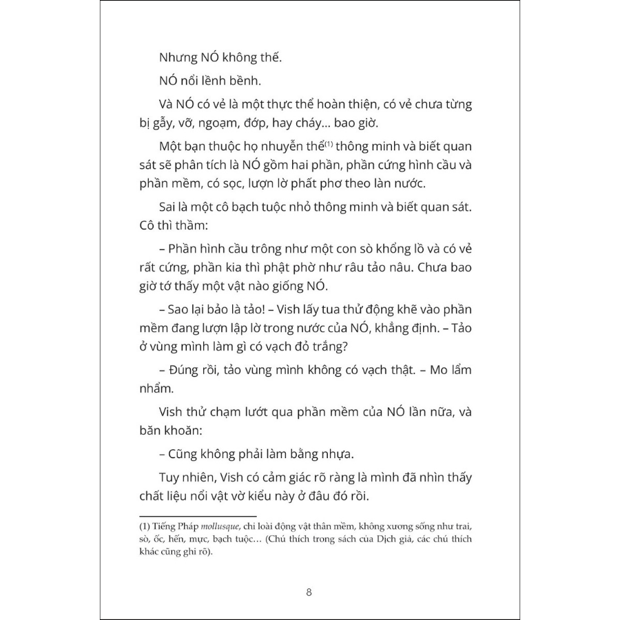 Tóm tắt nội dung Trên mặt nước của rốn biển xanh, một điều kì lạ đã xảy ra. NÓ, cứng như một con sò khổng lồ màu xám, mềm như tảo với vạch đỏ và trắng, và là vật thể đầu tiên do bầu trời khạc xuống mà lại không chìm nghỉm. Mo, Sai, và Vish, ba bạn bạch tuộc nhỏ sinh sống ở vùng này cũng đã từng nhìn thấy rất nhiều vật lạ, vật nhọn, vật tròn, hàng núi vật thể bằng nhựa, to nhỏ dài méo, rồi cả nham thạch… từ trên trời rơi xuống. Nhưng một vật như thế này thì chưa từng thấy bao giờ. Chưa hết, hình như có một cái gì còn sống ở trong NÓ. Nguy hiểm hơn, NÓ có vẻ to gần như Krakenko, con cá voi sát thủ khủng khiếp. Và đáng sợ nhất, NÓ có một cái miệng, và có vẻ rất tham ăn. Cần phải nhảy điệu Tcha-kou-tcha ngay để gọi tất cả cộng đồng. Hải quỳ bạch tạng, cua sừng và cả đám tôm sú béo phì… trong hang Antre, không ai có đáp án cho hàng trăm câu hỏi. Nhưng có thể câu trả lời sẽ được mang tới từ Mế-Hế-Hế-Hế? Trích nhận xét và đánh giá Lời dịch giả Lê Y Linh: “Có lẽ kỉ niệm sâu sắc nhất thời đi học mà tôi còn nhớ ở cái tuổi "nhất quỷ nhì ma" là khi cha tôi đã dạy cho tôi tín hiệu Morse. Tôi đã từng "vỡ lòng" cho một vài bạn thân trong lớp để viết tin nhắn cho nhau và giữ được bí mật. Năm mươi năm sau, tôi khám phá lại sự hấp dẫn ma mị của tín hiệu Morse trong cuốn sách này và không khỏi bùi ngùi. Các em hãy thử học để viết những câu đối thoại bằng Morse xem sao nhé. Và nếu có dịp hãy tả về niềm vui của mình khi các em biết viết những câu đầu tiên bằng "mật ngữ" Morse khi trao đổi được với bạn bè của mình. Biển không chỉ là sóng nước, bờ cát, bầu trời mà biển cả còn là nơi rộng lớn hàng vạn dặm vuông, chứa đựng hàng trăm triệu mét khối nước. Biển có nhiều tầng sâu và có vô vàn các sinh vật khác nhau. Nói về biển, các em có thể hình dung đó là du thuyền, là người đánh cá, là hoàng hôn, là bình minh, là bình yên dịu dàng, là mưa, là bão, là gió, là thủy triều, là cá, là tôm, là cua, là san hô… Và đây, biển khơi và đại dương bao la là nơi mà các em sẽ cùng các bạn bạch tuộc nhỏ khám phá trong cuốn sách này.” Độ tuổi Từ 7 tuổi +