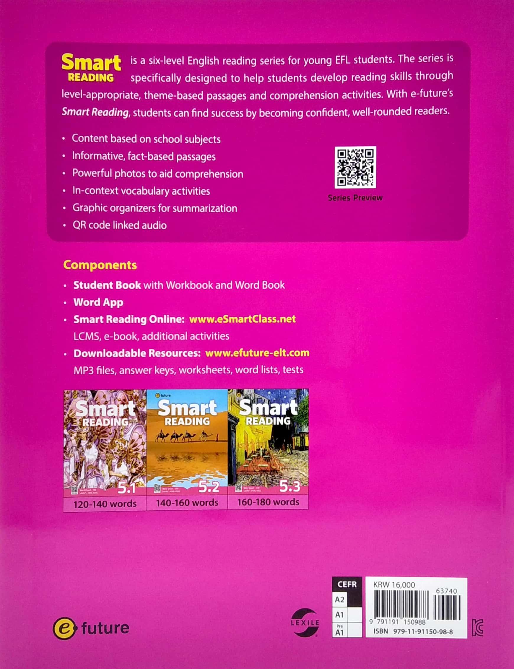 Is a six-level English reading series for young EFL students. The series is specifically designed to help students develop reading skills through level-appropriate, theme-based passages and comprehension activities. With e-future's Smart Reading, students can find success by becoming confident, well-rounded readers.