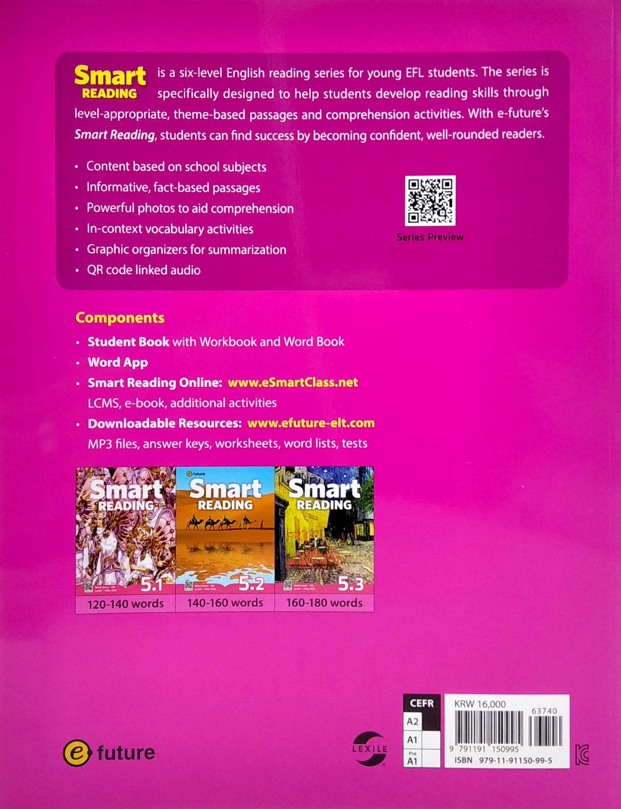 Is a six-level English reading series for young EFL students. The series is specifically designed to help students develop reading skills through level-appropriate, theme-based passages and comprehension activities. With e-future's Smart Reading, students can find success by becoming confident, well-rounded readers.