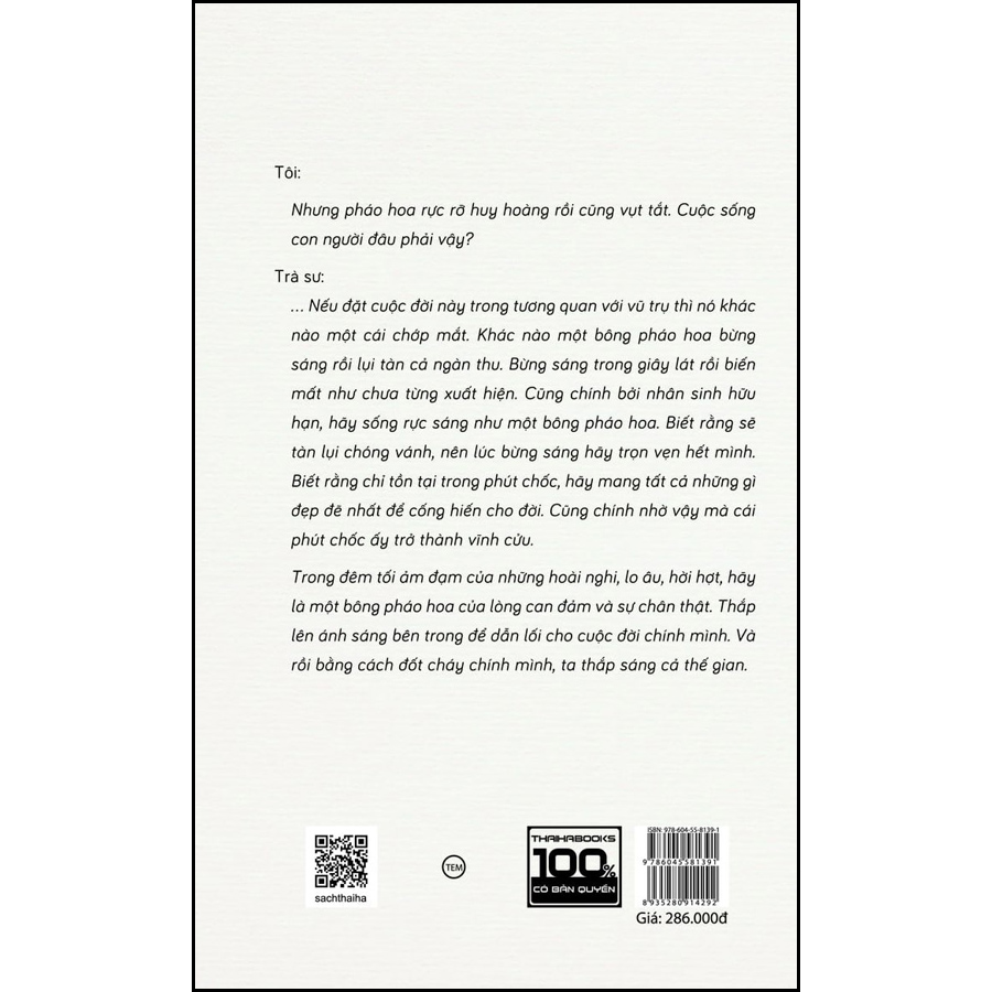 Cuốn sách “Sống như bông pháo hoa” là một cuộc hành trình khám phá điều quý giá nhất cuộc đời. Trong phòng trà giản dị, yên bình giữa núi rừng Đà Lạt, chúng ta được xem thước phim tua chậm về cuộc trò chuyện giữa tác giả và Trà sư. Độc giả như thấy chính mình qua những trải lòng và suy tư của tác giả Ruby Nguyen, tuy có lúc chông chênh và mất phương hướng nhưng mỗi người là một mảnh ghép không thể thiếu trong bức tranh cuộc đời rộng lớn. Những lời khuyên đầy tính triết lý, nhân văn của Trà sư khiến chúng ta hiểu ra một điều: Chỉ có tình yêu thương và tấm lòng rộng mở mới khiến chúng ta tìm được bình yên nơi tâm hồn và làm cuộc đời này trở nên ý nghĩa, đáng sống.