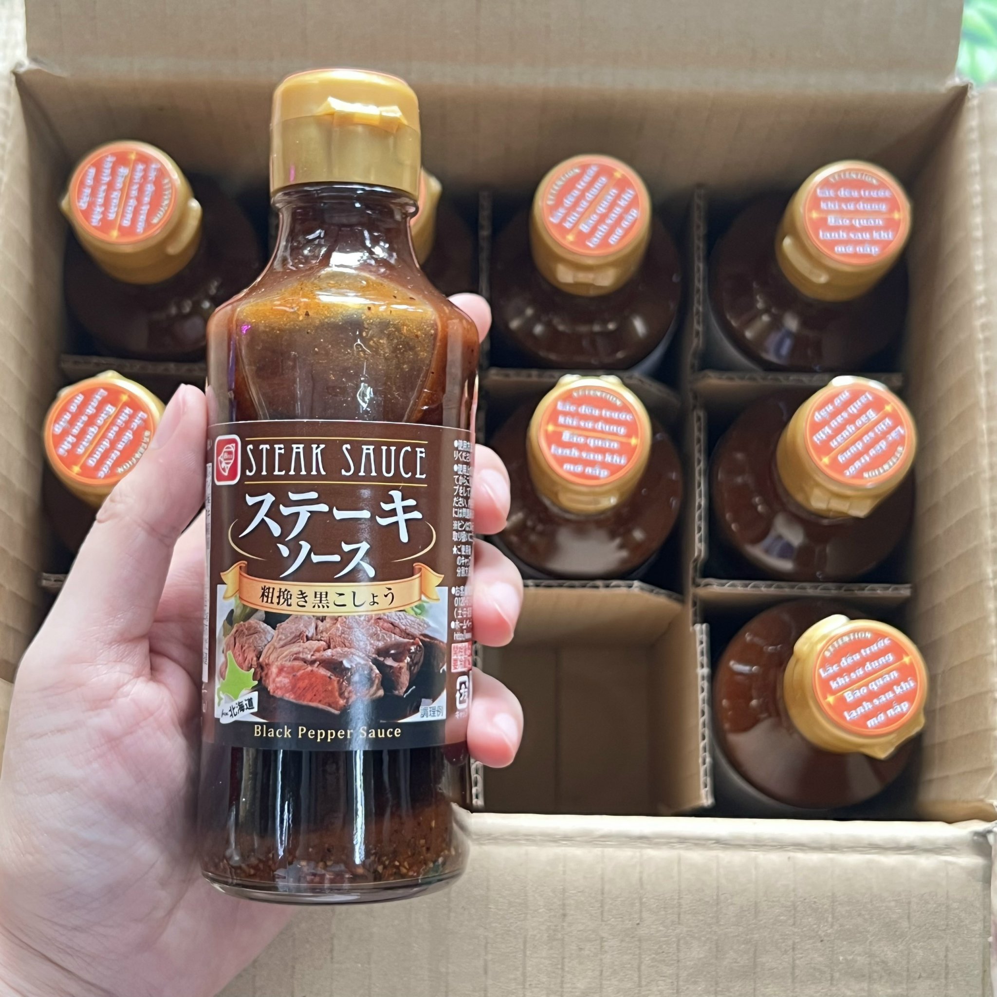 Mua tại TiktokSốt Steak Vị Tiêu Đen Sốt steak làm từ nước tương với vị ngọt của hành tây và vị thơm của hạt tiêu đen xay thô giúp món ăn thêm phần hấp dẫn. Đặc điểm sản phẩm: – Hương vị nước tương hòa quyện với vị ngọt của hành tây và vị thơm của hạt tiêu đen xay thô hấp dẫn. – Sản phẩm được sản xuất theo công nghệ Nhật Bản hiện đại, không sử dụng chất bảo quản, an toàn cho s ức kh ỏe của bạn.