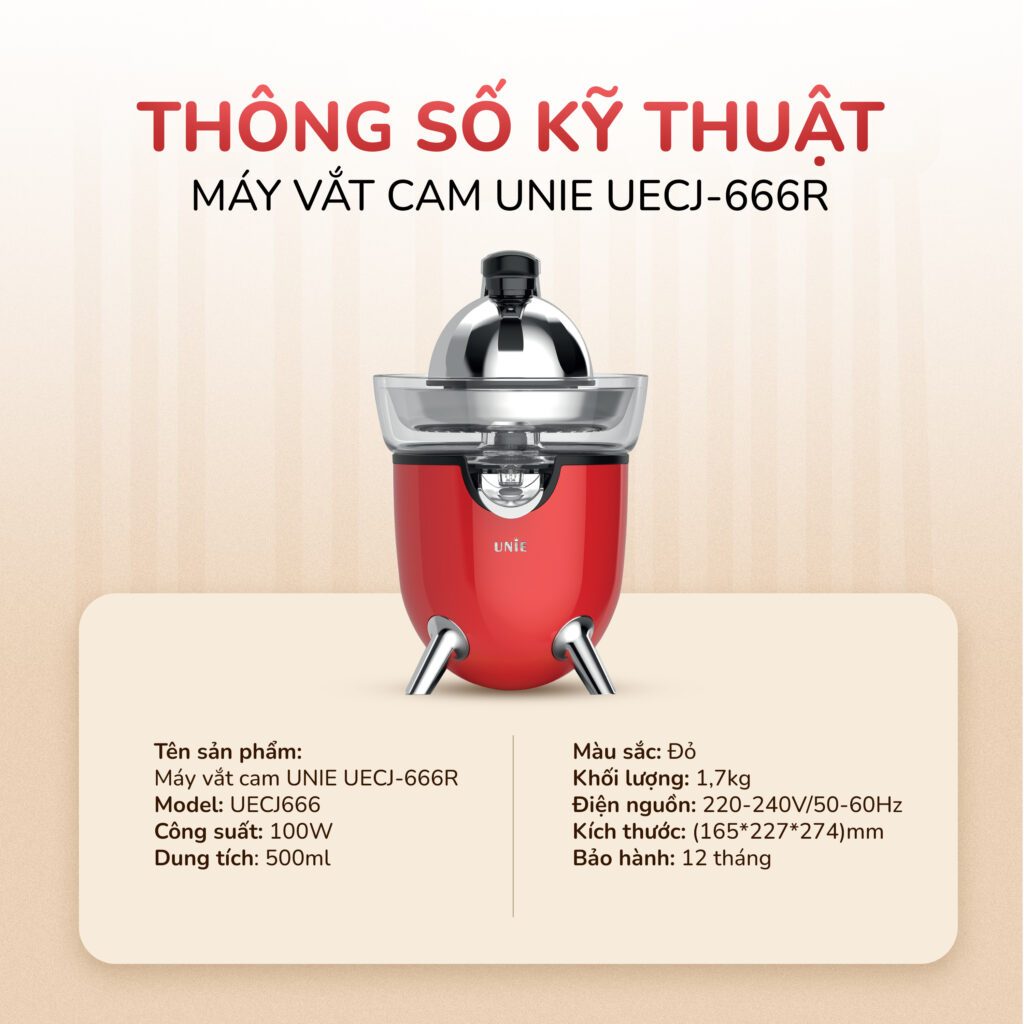 Máy vắt cam UNIE UECJ-666R Vắt kiệt ưu việt, ngọt lành tự nhiên Mang phong cách tân cổ điển sang trọng, UNIE UECJ-666R không chỉ tô điểm cho không gian bếp mà còn mang đến những ly nước ép tươi ngon mỗi ngày. Công suất 100W mạnh mẽ kết hợp với hai đầu ép hình nón, giúp vắt kiệt nước trong các loại trái cây thuộc họ cam quýt mà vẫn giữ trọn hương vị tự nhiên. Tay cầm ép tích hợp công tắc, thao tác nhẹ nhàng và tiện lợi hơn bao giờ hết. Vòi rót thông minh với cơ chế ngăn nhỏ giọt, giữ cho bề mặt bếp luôn sạch sẽ, gọn gàng. Chân đế chống trượt đảm bảo máy vận hành ổn định, đồng thời các bộ phận có thể tháo rời, thuận tiện cho việc vệ sinh sau mỗi lần sử dụng. Với Máy vắt cam UNIE UECJ-666R, việc thưởng thức một ly nước cam ngọt lành mỗi sáng chưa bao giờ dễ dàng đến thế. Công suất cực đại 100W – Ép nhanh, vắt kiệt Trên thị trường, hầu hết các dòng máy vắt cam gia đình có công suất dao động từ 40W – 85W. Với công suất vượt trội lên đến 100W, UNIE UECJ-666R sở hữu động cơ mạnh mẽ, giúp quá trình vắt diễn ra nhanh chóng và hiệu quả hơn. Máy vận hành ổn định, đầu ép quay nhanh, tối ưu lực vắt thu về tối đa lượng nước ép, hạn chế tình trạng sót nước trong bã. Nhờ công suất lớn, máy có thể vắt liên tục số lượng lớn cam, quýt mà không lo gián đoạn. Tốc độ quay ổn định – Không lo văng bắn Máy vắt cam UNIE UECJ-666R vận hành với tốc độ quay ổn định & đủ mạnh, đảm bảo vắt kiệt nước mà không văng bắn ra ngoài. Nước ép chảy qua lưới lọc, vòi dẫn & rót xuống cốc gọn gàng giữ cho bề mặt bếp & khu vực xung quanh luôn sạch sẽ sau mỗi lần sử dụng. Lưới lọc thép không gỉ – Bền bỉ, lọc sạch tối ưu Máy vắt cam UNIE UECJ-666R được trang bị lưới lọc bằng thép không gỉ cao cấp, có khả năng chống ăn mòn, chịu lực tốt và an toàn khi tiếp xúc với thực phẩm. Với thiết kế rãnh tách thông minh, lưới lọc giúp tách hạt và bã nhanh chóng, đảm bảo nước ép thu được mịn, tinh khiết, không lẫn bã. Chất liệu thép không gỉ không chỉ giúp duy trì hiệu suất lọc tối ưu mà còn dễ dàng vệ sinh, hạn chế bám bẩn và ngăn chặn sự phát triển của vi khuẩn. Vòi dẫn nước ép cải tiến – Chống nhỏ giọt hiệu quả Vòi dẫn nước ép bằng thép không gỉ cao cấp, có khả năng chống ăn mòn, chịu nhiệt tốt và không bám màu dù tiếp xúc thường xuyên với axit tự nhiên trong trái cây. Nhờ thiết kế hệ thống chống nhỏ giọt cải tiến, nước ép chỉ chảy ra khi gạt lẫy ở vòi dẫn xuống, giúp ngăn rò rỉ và hạn chế tình trạng nước ép nhỏ giọt gây bẩn bề mặt bếp. Vòi dẫn có đường kính tối ưu, đảm bảo dòng chảy ổn định, không trào ra ngoài, nước ép chảy trực tiếp vào ly không làm thất thoát. Thân máy & chân đế chắc chắn Sở hữu thân máy làm từ nhựa PP cao cấp, có độ bền cơ học cao, chịu lực tốt, giúp thiết bị nhẹ hơn, dễ di chuyển và thuận tiện khi vệ sinh. Bề mặt nhựa nhẵn mịn, hạn chế bám bẩn, quá trình lau chùi sau mỗi lần sử dụng cũng trở nên đơn giản hơn. Phần chân đế chống trượt, cũng được làm từ nhựa PP cao cấp, giúp máy bám chắc trên mặt bàn, giảm rung lắc khi vận hành. Nhờ đó, máy hoạt động ổn định ngay cả khi vắt với công suất lớn, hạn chế tình trạng trơn trượt hay xê dịch, đảm bảo an toàn trong quá trình sử dụng.   Đầu ép hình nón – Vắt kiệt ưu việt Tay cầm ép công thái học & Công tắc xoay tự động  Máy được trang bị tay cầm ép thiết kế theo nguyên lý công thái học, giúp phân bổ lực đồng đều, giảm áp lực lên cổ tay, hỗ trợ vắt kiệt nước ép mà không tốn nhiều sức. Nhờ công tắc xoay tự động, đầu ép sẽ tự động xoay khi nhấn tay cầm xuống, đảm bảo tách triệt để nước ép khỏi tép trái cây mà không cần thao tác thủ công. Kích thước nhỏ gọn dễ dàng bảo quản Sở hữu thiết kế nhỏ gọn với kích thước chỉ (165×227×274)mm, dù đặt ở vị trí nào trong bếp UECJ-666R cũng không chiếm nhiều diện tích.   Chức năng bảo vệ quá nhiệt an toàn   Thông số kỹ thuật