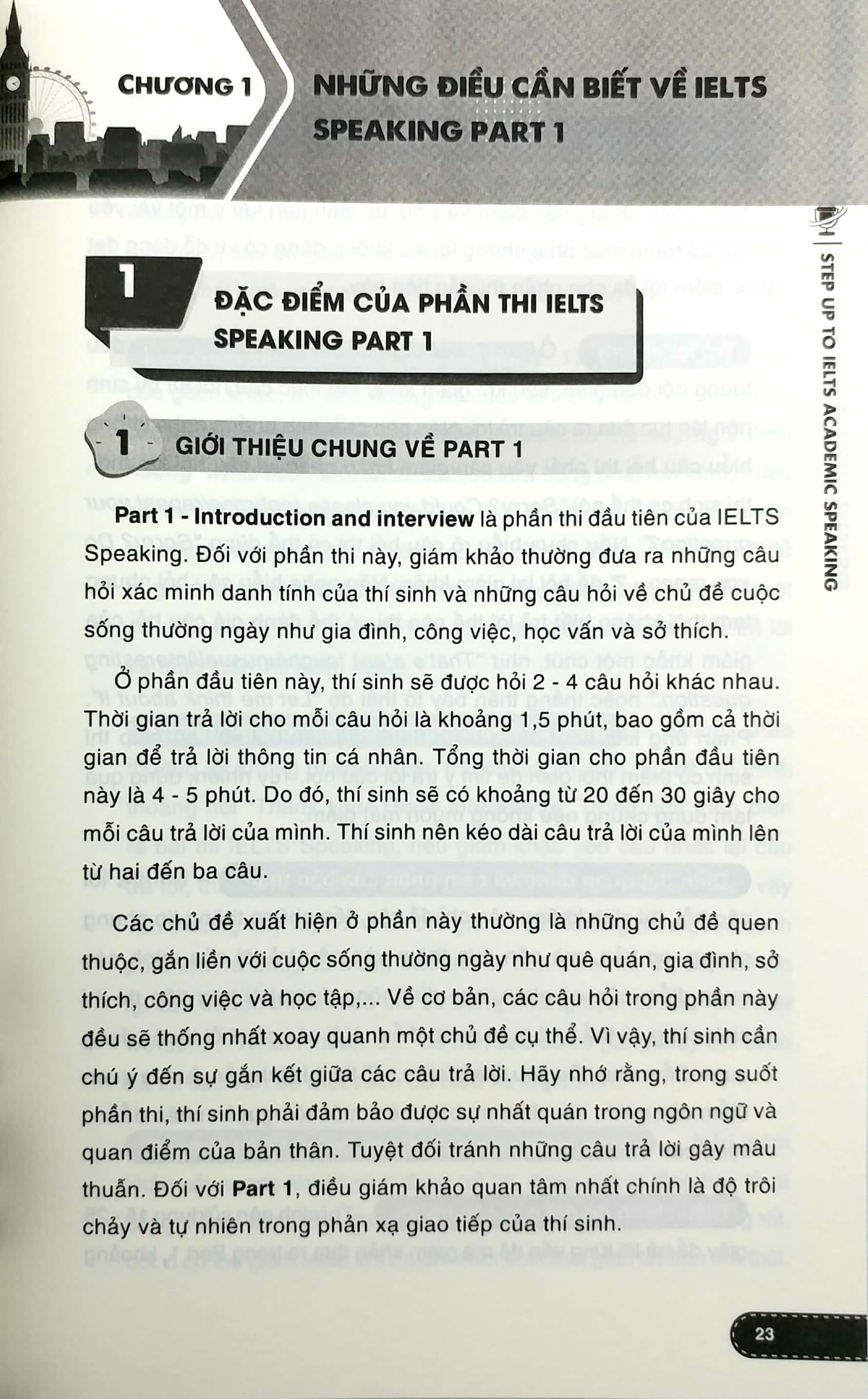 Cuốn sách “Step Up To IELTS Academic SPEAKING” nằm trong bộ sách “Step up to IELTS Academic” là bộ sách gồm bốn kỹ năng “listening/ speaking/ reading/ writing” được cô đọng kiến thức và hỗ trợ tối đa cho thí sinh trong việc làm quen dạng đề và nhận diện dạng bài. Đặc biệt là định hình và xây dựng thói quen, phương pháp học tập hiệu quả để hệ thống kiến thức, dành cho người mới bắt đầu và muốn ôn luyện chuyên sâu; tổng hợp đầy đủ nhất các dạng bài trong đề thi IELTS. Thí sính sẽ dễ dàng nắm bắt được trọng điểm kiến thức để học nhanh nhớ lâu. Hệ thống bài mẫu và ví dụ minh họa chi tiết giúp thí sinh dễ dàng hiểu và tránh được những lỗi sai thường gặp trong quá trình làm bài. Các mẹo hay, tips nhỏ giúp thí sinh có thêm kinh nghiệm khi chinh phục từng kỹ năng của bài thi IELTS. Bên cạnh việc cô đọng kiến thức, bộ sách còn giúp các thí sinh nâng cao vốn từ vựng hay làm quen với cách tính điểm, tiêu chí chấm của giám khảo để từ đó có chiến lược học tập thích hợp. Hệ thống bài tập, bài thi mẫu đa dạng nhiều chủ đề giúp thí sinh đa dạng hơn trong cách viết, rèn luyện kỹ năng nghe chuyên sâu, đọc hiểu nhanh hay xây dựng lập luận chặt chẽ đối với kỹ năng nói, thông qua đó tự đánh giá được năng lực ngoại ngữ của bản thân để có chiến lược học tập hiệu quả hơn.