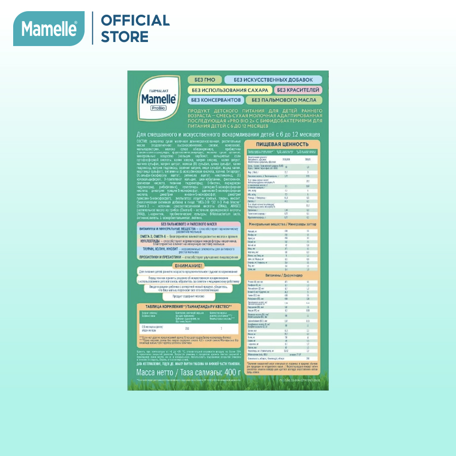 COMBO 2 HỘP SỮA BỘT CÔNG THỨC MAMELLE PRO BIO SỐ 2 CHO TRẺ TỪ 6 ĐẾN 12 THÁNG HỘP 400G/HỘP THÔNG TIN SẢN PHẨM - Thương hiệu: Mamelle - Xuất xứ sản phẩm: Nga