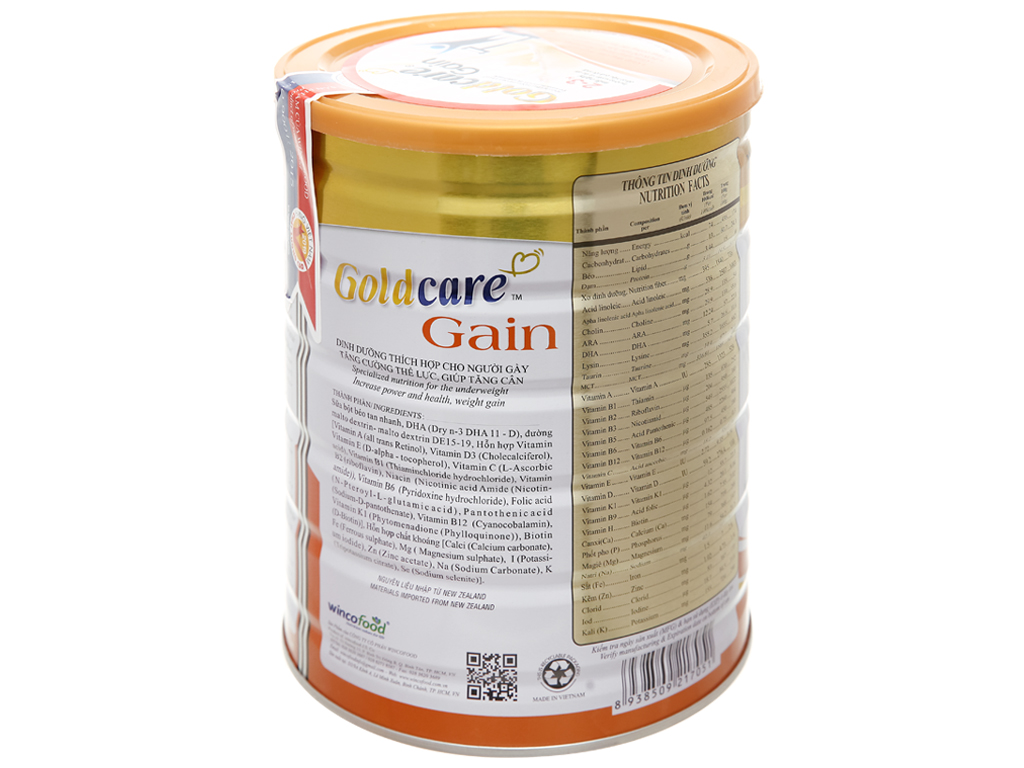 Thành phần và công dụng Thành phần: Sữa bột, non dairy cream, mantodextrin, dextro, DHA, ARA, canxi, vitamin (A, B1, B6, B12, D, E, C,...), natri, kali, sắt, kẽm,.... Sữa bột Goldcare Gain dinh dưỡng cho