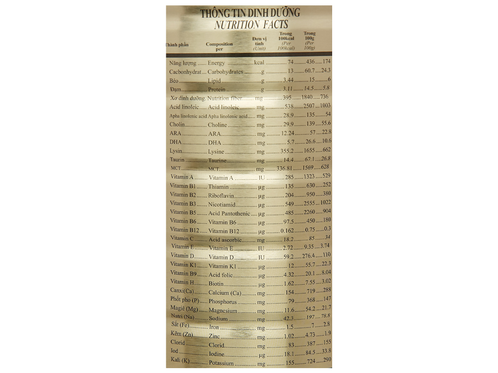 1. Thành phần: Sữa bột, Whey protein, Soy protein, Maltodextrin, Sữa non, L-Lysine HCL, FOS, Canxi Nano, Taurine, Choline, DHA, ARA, Vitamin (Vitamin A, Vitamin C, Vitamin D, Vitamin E, Vitamin D3, Vitamin K2,