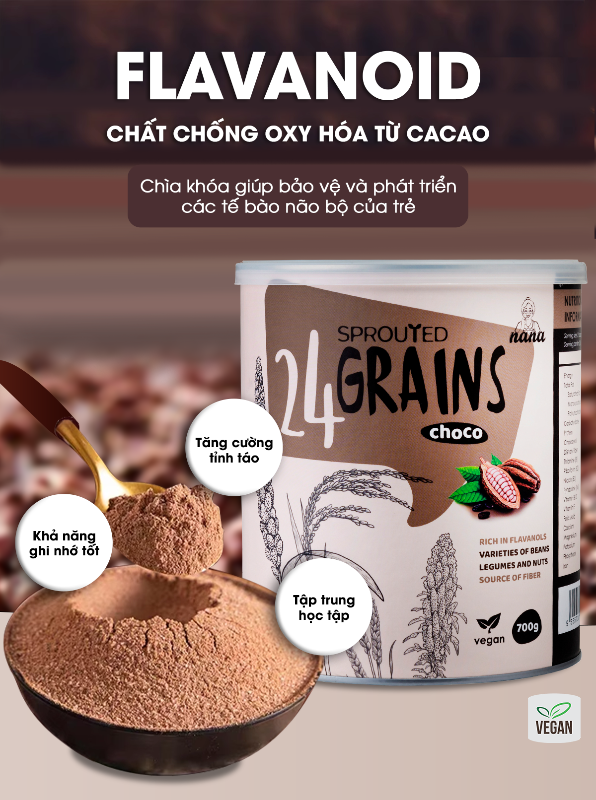 • FLAVANOID (chất chống oxy hóa) từ cacao giúp con tăng sự TỈNH TÁO, TẬP TRUNG, KHẢ NĂNG GHI NHỚ