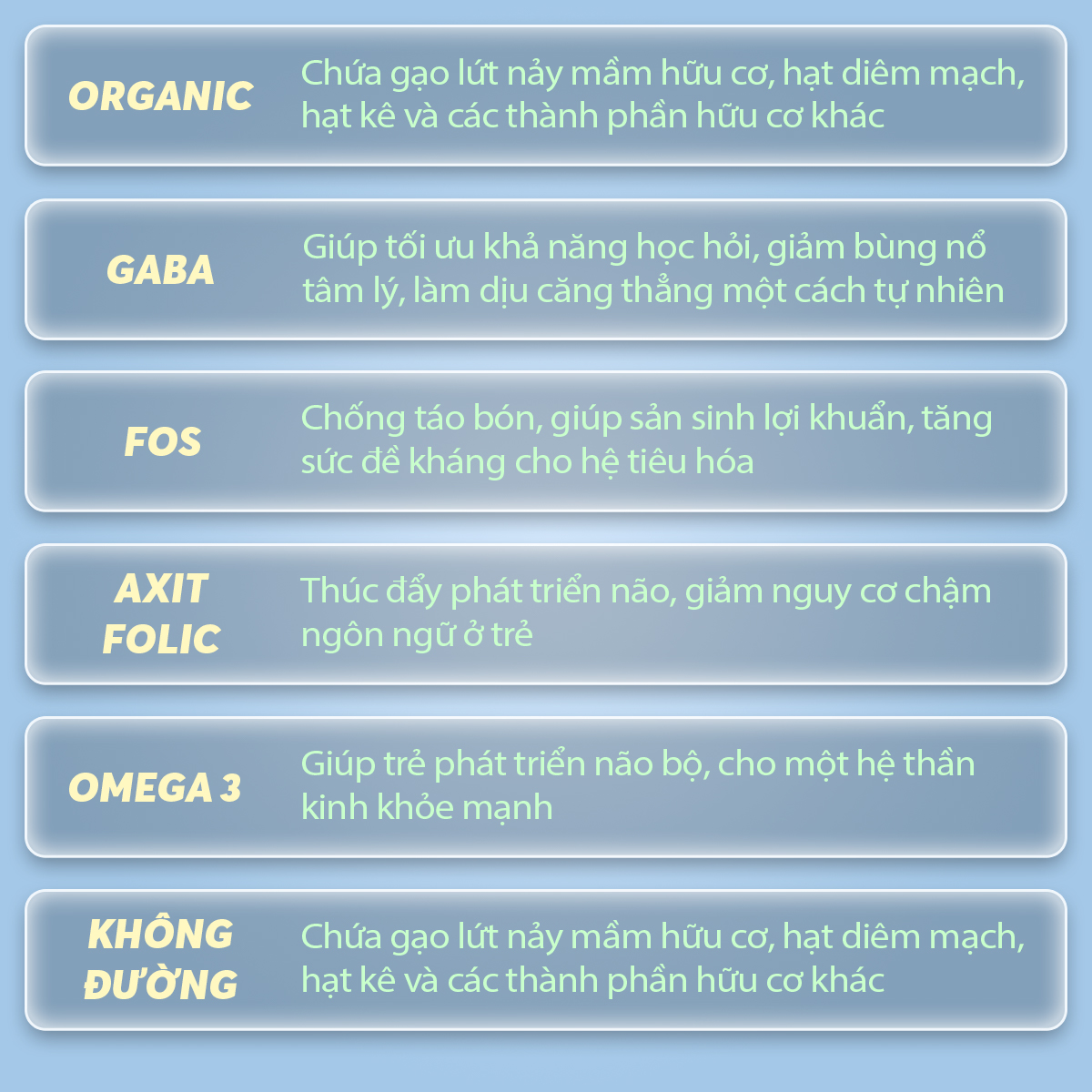 Thay thế bữa ăn phụ hoặc bổ sung cho chế độ ăn hàng ngày thiếu vi chất dinh dưỡng Giúp phát triển trí não và thị giác Giúp phát triển chiều cao Tăng cường sức