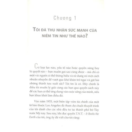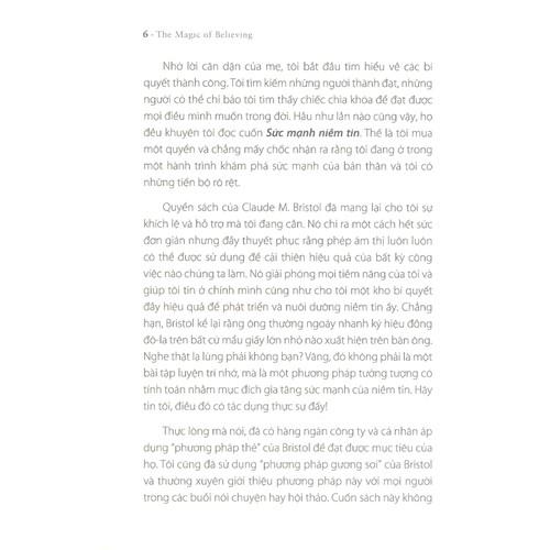 Sức mạnh niềm tin của Claude M. Bristol sẽ mang lại cho bạn đọc sự khích lệ và hỗ trợ mà các bạn đang cần. Nó chỉ ra một cách hết sức đơn giản nhưng đầy thuyết phục rằng phép ám thị luôn luôn có thể được sử dụng để cải thiện hiệu quả của bất kỳ công việc nào. Nó giải phóng mọi tiềm năng và giúp chúng ta tin ở chính mình, đó cũng là một kho bí quyết đầy hiệu quả để phát triển và nuôi dưỡng niềm tin ấy. Chẳng hạn, Bristol kể lại rằng ông thường vẽ nhanh ký hiệu đồng đô-la trên bất cứ mẩu giấy lớn nhỏ nào xuất hiện trên bàn ông. Nghe thật lạ lùng phải không bạn? Vâng, đó không phải là một bài tập luyện trí nhớ, mà là một phương pháp tưởng tượng có tính toán nhằm mục đích gia tăng sức mạnh của niềm tin.