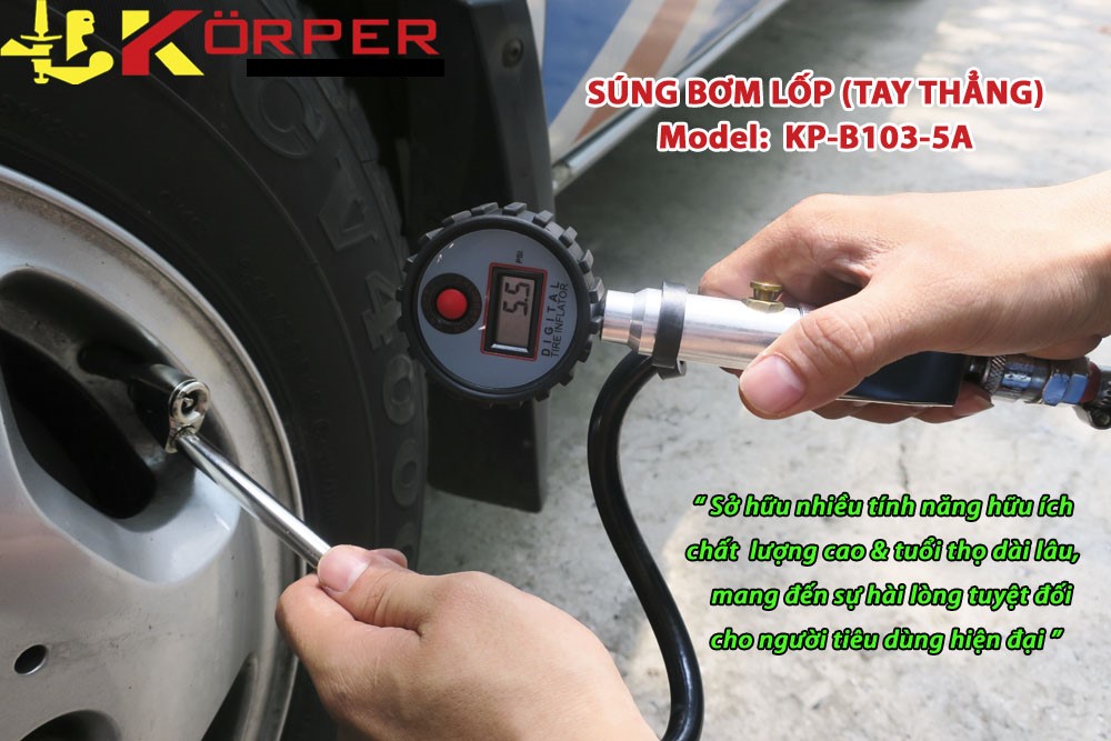 - Súng bơm lốp tay thẳng điện tử Körper KP-B103-5D sở hữu nhiều tính năng hữu ích và hiện đại, đồng thời chất lượng cũng như tuổi thọ khá ổn. ƯU ĐIỂM NỔI BẬT CỦA SÚNG BƠM LỐP KÖRPER KP-B103-5D :