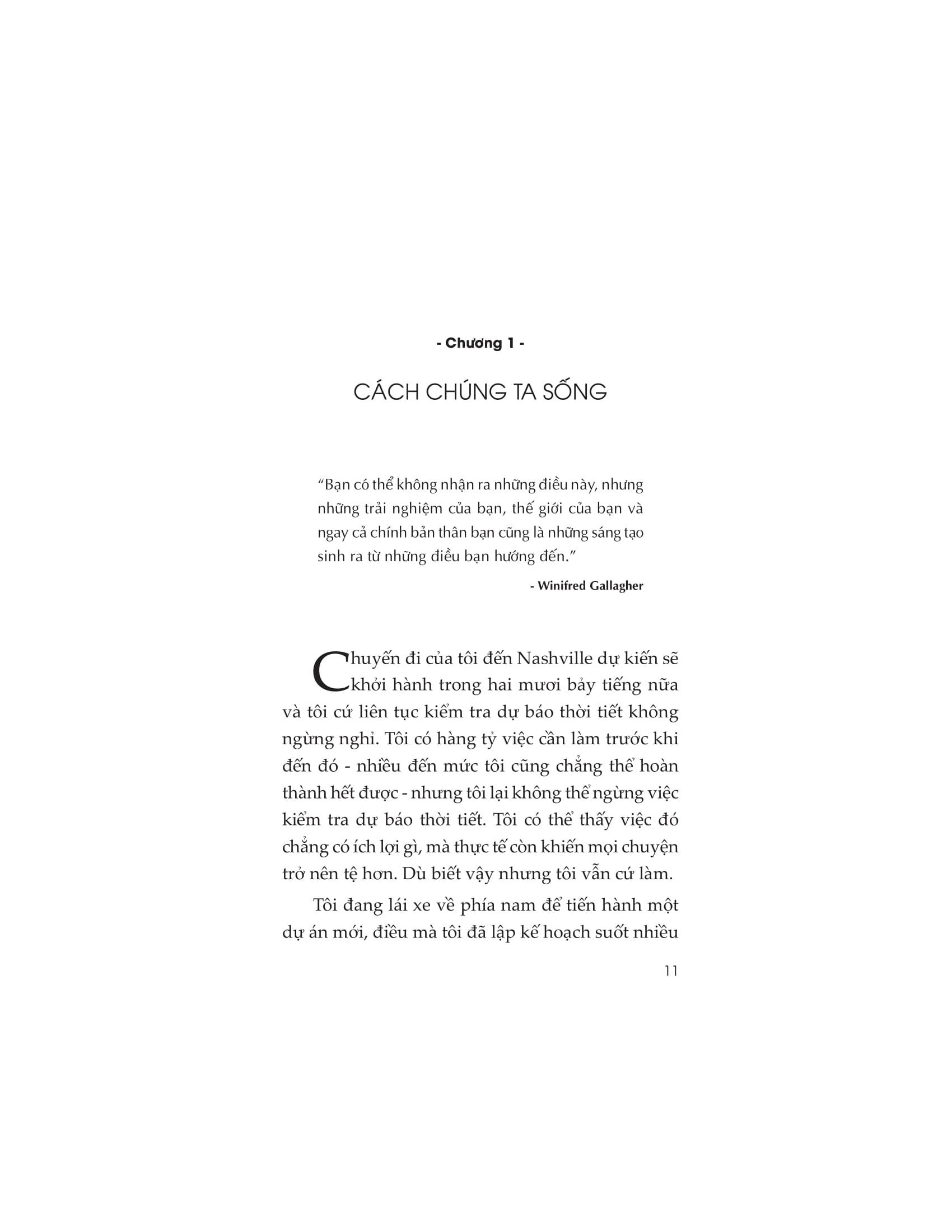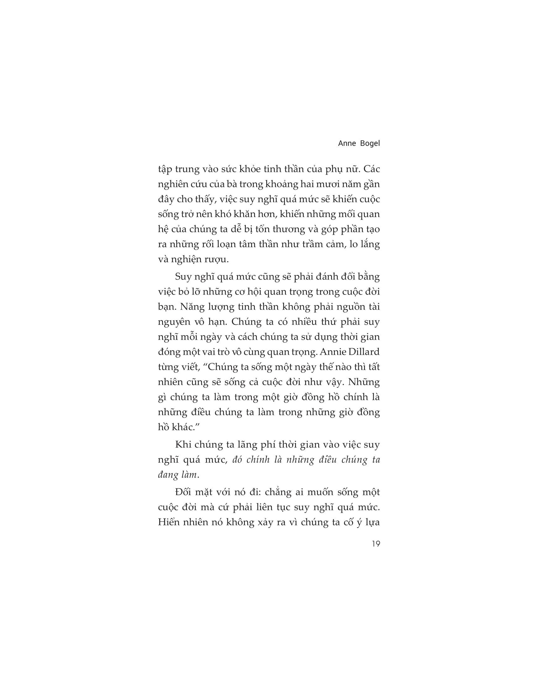 thể xảy ra trong tương lai. Việc cứ nghĩ ngợi quanh đi quẩn lại làm chúng ta cảm thấy không thoải mái chút nào, nhưng nếu không có những nguyên tắc hoặc triết lý nhất quán hướng dẫn, chúng ta dường như không thể tự cứu rỗi chính mình. Dù những mối bận tâm của bạn lớn hay nhỏ thì chúng đều có điểm chung: những suy nghĩ đó lặp đi lặp lại, không hề lành mạnh và hết sức vô ích.