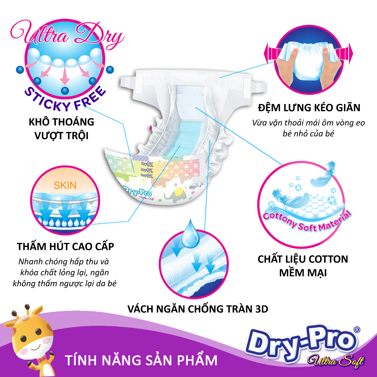 Tã dán Dry-Pro đã và đang trở thành một trong những sự lựa chọn ưu tiên của các bà mẹ Việt bởi những ưu điểm hết sức vượt trội sau:-Khả năng thấm hút cực tốt, nhanh chóng hấp thu và khóa chất lỏng lạ...