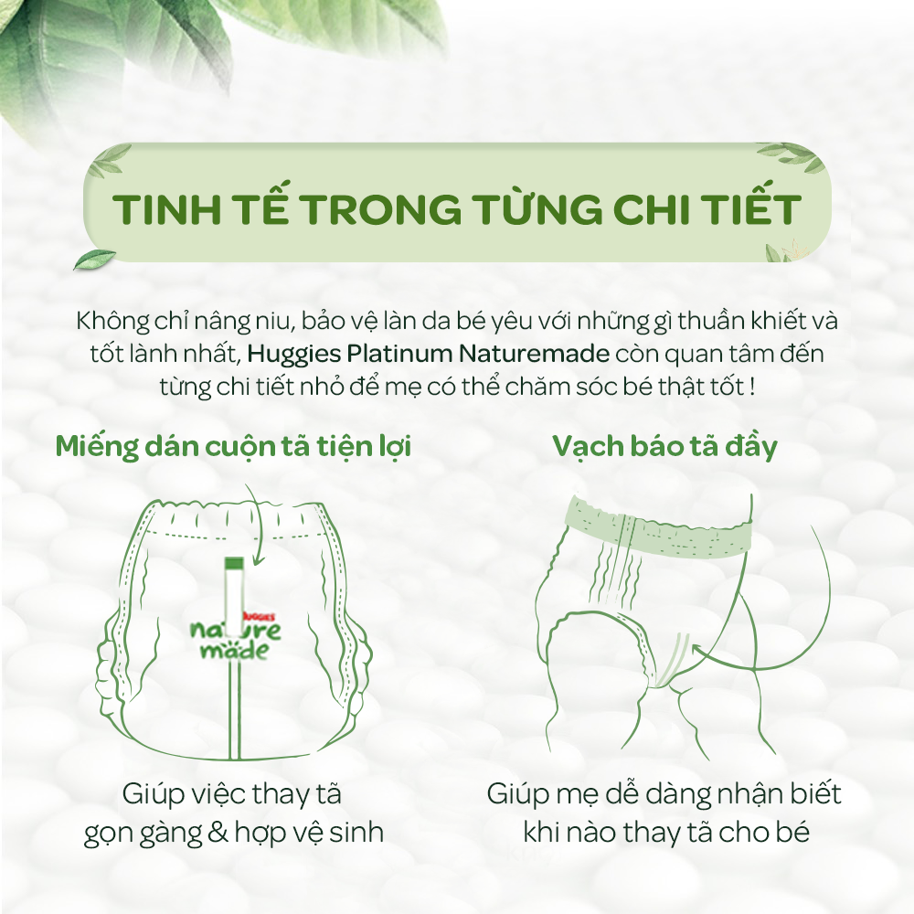 Mua tại TiktokGiới thiệu Bỉm tã dán Huggies Platinum Nature Made miếng cải tiến từ dòng Platinum cao cấp, mang tới các ưu điểm nổi bật hơn về chất liệu. Tã giấy sử dụng 100% nguyên liệu sợi tự nhiên nhập khẩu từ Châu Âu, bổ sung thêm vitamin E chăm sóc tốt nhất cho làn da mỏng manh và nhạy cảm của bé. Bên cạnh đó, sản phẩm vẫn tiếp tục duy trì các công nghệ cao cấp từ dòng Platinum như thiết kế siêu mỏng nhẹ chỉ 5mm, lõi bông 360 độ siêu linh hoạt, không vón cục, bề mặt 3D thấm hút nhanh và khả năng thấm hút vượt trội duy trì khô thoáng tới 12 tiếng. Kích thước