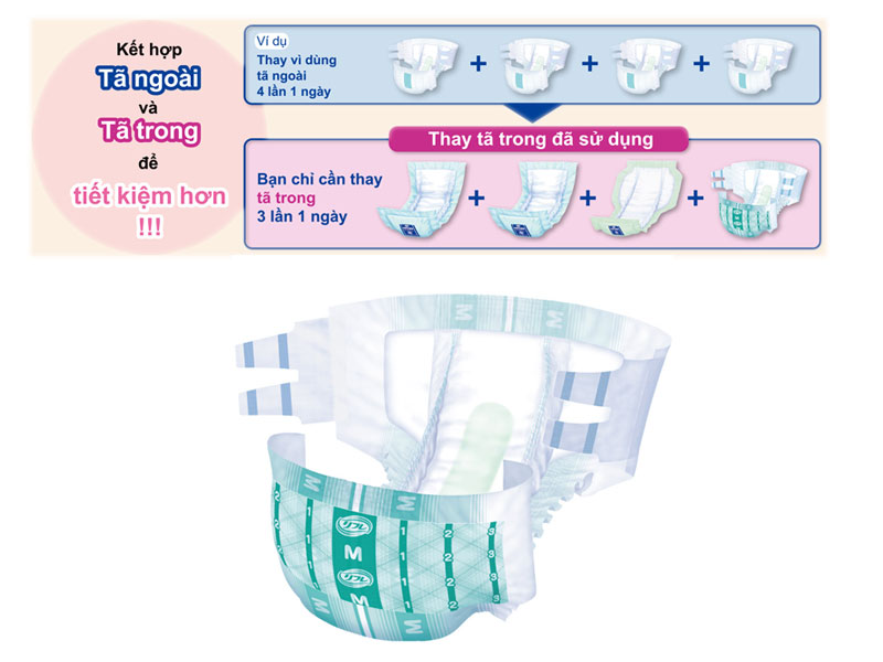 - Nên thay 3 miếng lót bổ sung (mỗi lần 1 miếng) trên cùng 1 miếng tã bao ngoài, rồi sau đó dùng riêng miếng tã dán bao ngoài vào lần cuối cùng để tiết kiệm.