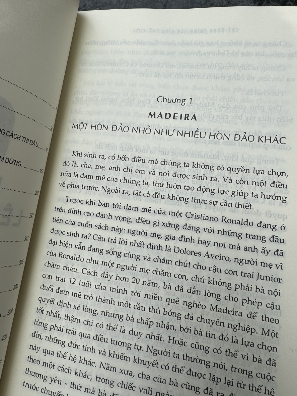 Trước khi bàn tới đam mê của một Cristiano Ronaldo đang ở trên đỉnh cao danh vọng, điều gì xứng đáng với những trang đầu tiên của cuốn sách này: người mẹ, gia đình hay nơi mà anh ấy đã được sinh ra? Câu trả lời nhất định là Dolores Aveiro, người mẹ vĩ đại hiện vẫn đang sống cùng và chăm chút cho cậu con trai Junior của Ronaldo như một người mẹ chăm con, chứ không phải bà nội chăm cháu. Cách đây hơn 20 năm, bà đã dằn lòng cho phép cậu con trai 12 tuổi của mình rời miền quê nghèo Madeira để theo đuổi đam mê trở thành một cầu thủ bóng đá chuyên nghiệp. Một quyết định xé lòng, nhưng bà chấp nhận, bởi bà tin đó là lựa chọn tốt nhất, thậm chí có thể là duy nhất. Hoặc cũng có thể vì bà đã từng phải trải qua điều tương tự. Người ta thường nói, trong cuộc đời, những đức tính và khiếm khuyết có thể được lặp lại từ thế hệ này qua thế hệ khác. Năm xưa, cha của bà cũng đã ra đi, mặc dù theo một cách khác, trong chiếc vali ngày xưa ấy không có niềm thương yêu - thứ mà bà đã ních chặt trong vali của cậu con trai trước chuyến bay đến Lisbon
