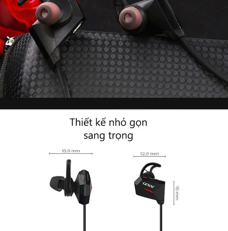 TAI NGHE BLUETOOTH VÒNG CỔ THỂ THAO GENAI SPORT 7   Tai nghe bluetooth vòng cổ thể thao Genai Sport 7 là dòng tai nghe cao cấp chuyên dành cho dân thể thao. Với sản phẩm này, cho dù bạn đang thực hiện những động tác mạnh và liên tục cũng không lo rơi rớt tai nghe trong quá trình tập luyện. Đồng thời, bạn còn được hòa mình vào âm nhạc thư giãn hoặc thậm chí là trò chuyện qua điện thoại một cách dễ dàng         ĐẶC ĐIỂM NỔI BẬT Đàm thoại liên tục 6 tiếng Việc trang bị chiếc tai nghe bluetooth vòng cổ thể thao Genai Sport 7 trong lúc tập luyện sẽ giúp bạn nhận cuộc gọi dễ dàng và liên tục suốt 6 tiếng. Do đó, bạn thoải mái trò chuyện mà không làm gián đoạn sự tập luyện của mình     Phạm vi kết nối rộng đến 10m Tính năng kết nối bluetooth chuẩn 4.2 thích hợp hầu hết cho những điện thoại hiện có trên thị trường trong phạm vi lên đến 10m, nhưng vẫn đảm bảo cho ra âm thanh sống động, mượt mà, chống ồn, chống nhiễu     Chống nước, mồ hôi chuẩn IP56 Quá trình tập luyện thể thao sẽ tốn rất nhiều mồ hôi, hiểu được điều này, GENAI đã tích hợp khả năng chống nước, chống mồ hôi rất tốt. Ngay cả khi đi ngoài mưa, tai nghe bluetooth vòng cổ thể thao Genai Sport 7 cũng sẽ không hề hấn gì     THIẾT KẾ SẢN PHẨM   Sành điệu và trẻ trung Tai nghe bluetooth vòng cổ thể thao Genai Sport 7 là dòng tai nghe cao cấp, kích thước nhỏ gọn sang trọng góp phần thể hiện sự năng động của bạn. Kết hợp thiết kế vây cá cao su nhét vành tai chắc chắn, sẽ không có tình trạng rơi rớt khi đeo như những dòng tai nghe thông thường