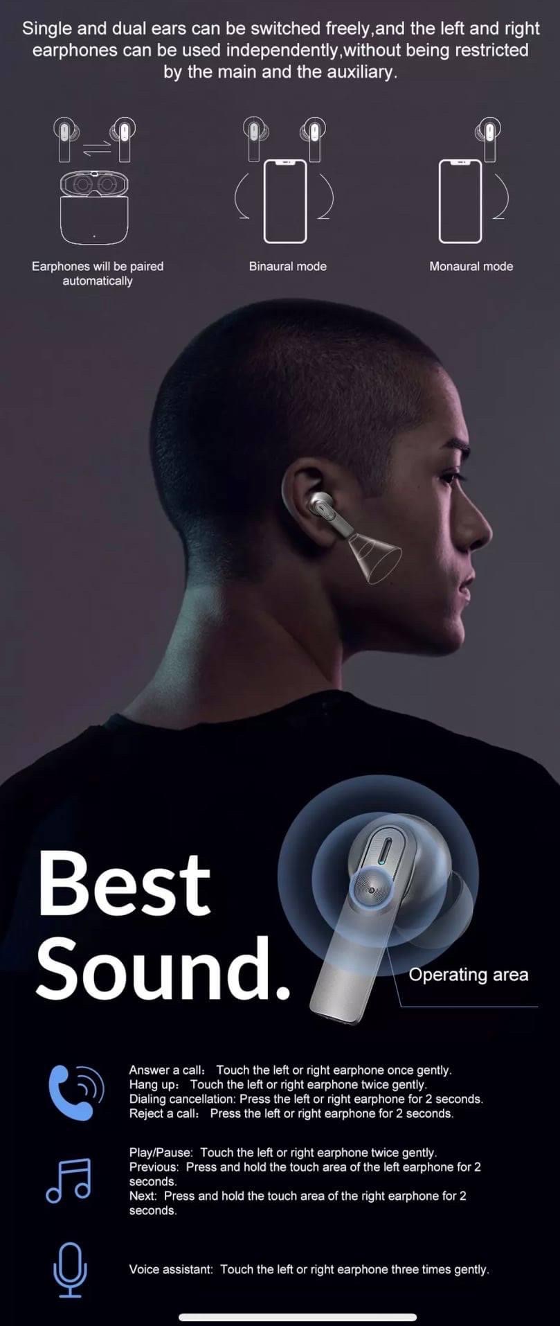 Đặc trưng: - Chip bluetooth 5.0 thế hệ mới, tiêu thụ điện năng thấp, trải nghiệm thời lượng pin mạnh mẽ hơn. - Tai nghe trái phải đều có chức năng tai nghe bluetooth hoàn