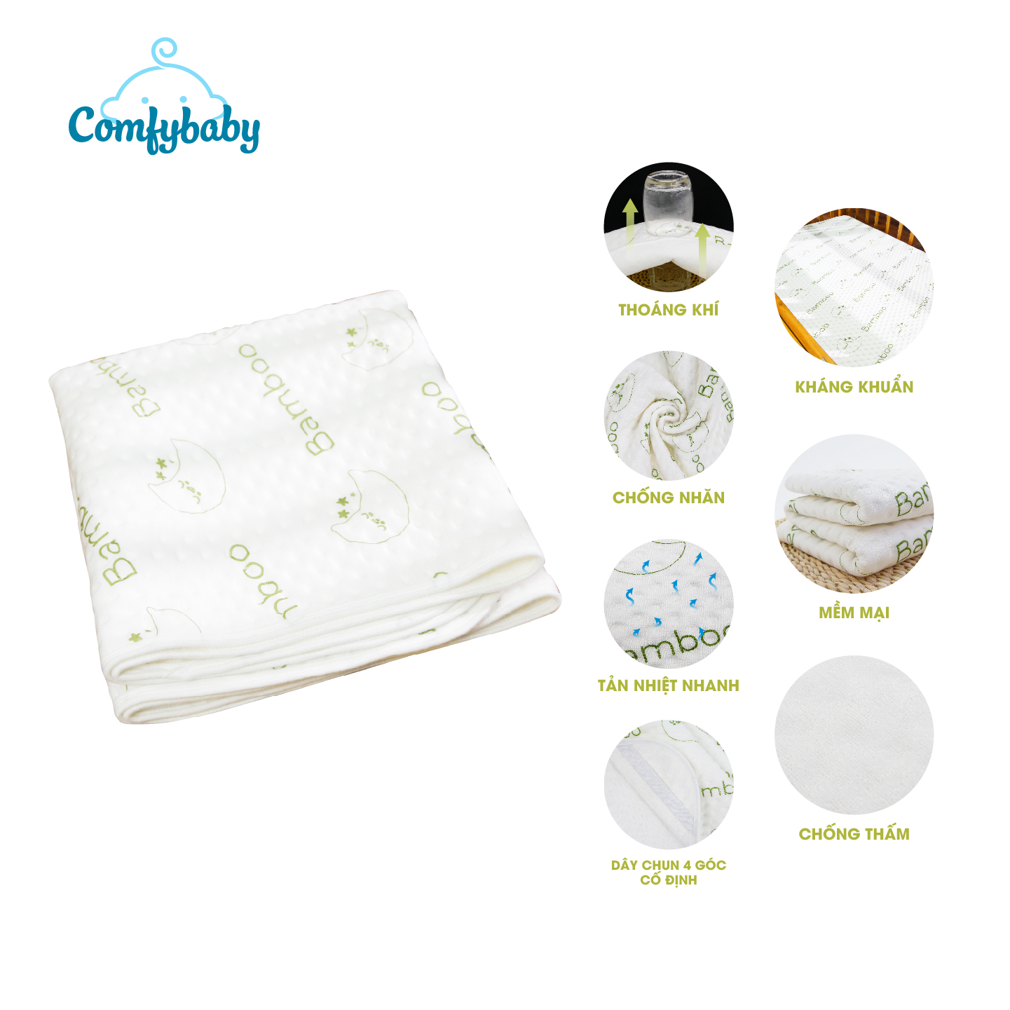 - Mẹ không còn thời gian thảnh thơi để tận hưởng niêm vui làm mẹ: có Tấm lót chống thấm mẹ chỉ còn mỗi việc cho bé ăn thôi. THÔNG TIN CHI TIẾT SẢN PHẨM Chất liệu: Vải bông 100% Ogranic Cotton ( hữu cơ) Cấu trúc: 4 lớp Công dụng: thấm hút Nơi sử dụng: giường, nệm, ga, nôi, cũi, ghế, sàn nhà, xe hơi, ngoài trời, du lịch…. Kích thước: 50 x 70 cm Đối tượng: Trẻ em ( từ 0 tháng tuổi đến 5 tuổi), người bệnh không tự chủ tiểu tiện, phụ nữ trong kỳ kinh nguyệt hoặc mẹ sau sinh THÔNG TIN THƯƠNG HIỆU: Comfybaby - cùng mẹ mang tới những năm tháng đầu đời trọn vẹn nhất cho bé. Những năm tháng đầu đời, làn da của trẻ vô cùng mỏng manh, sức đề kháng kém nên luôn cần sự chăm sóc đặc biệt. Cũng chính vì vậy mà việc lựa chọn sản phẩm chăm sóc bé như thế nào cho an toàn và phù hợp là mối quan tâm hàng đầu đối với bậc làm cha làm mẹ. Comfybaby lắng nghe tâm tự của mẹ, hoàn thiện và hướng tới con yêu mỗi ngày, các sản phẩm của Comfybaby đều bắt nguồn từ nguyên liệu tự nhiên, nhưng tiện lợi và tinh tế, cũng như đạt các tiêu chuẩn khắt khe nhất trên thế giới như: OEKO - TEX, SGS, ROH Comfybaby sau 5 năm hình thành, phát triển và đồng hành cùng 4babies tại Việt Nam, cho đến nay các sản phẩm của Comfybaby đã khẳng định được vị trí của mình trên thị trường nhờ yếu tố tự nhiên và an toàn tuyệt đối cho sức khỏe của trẻ khi sử dụng.