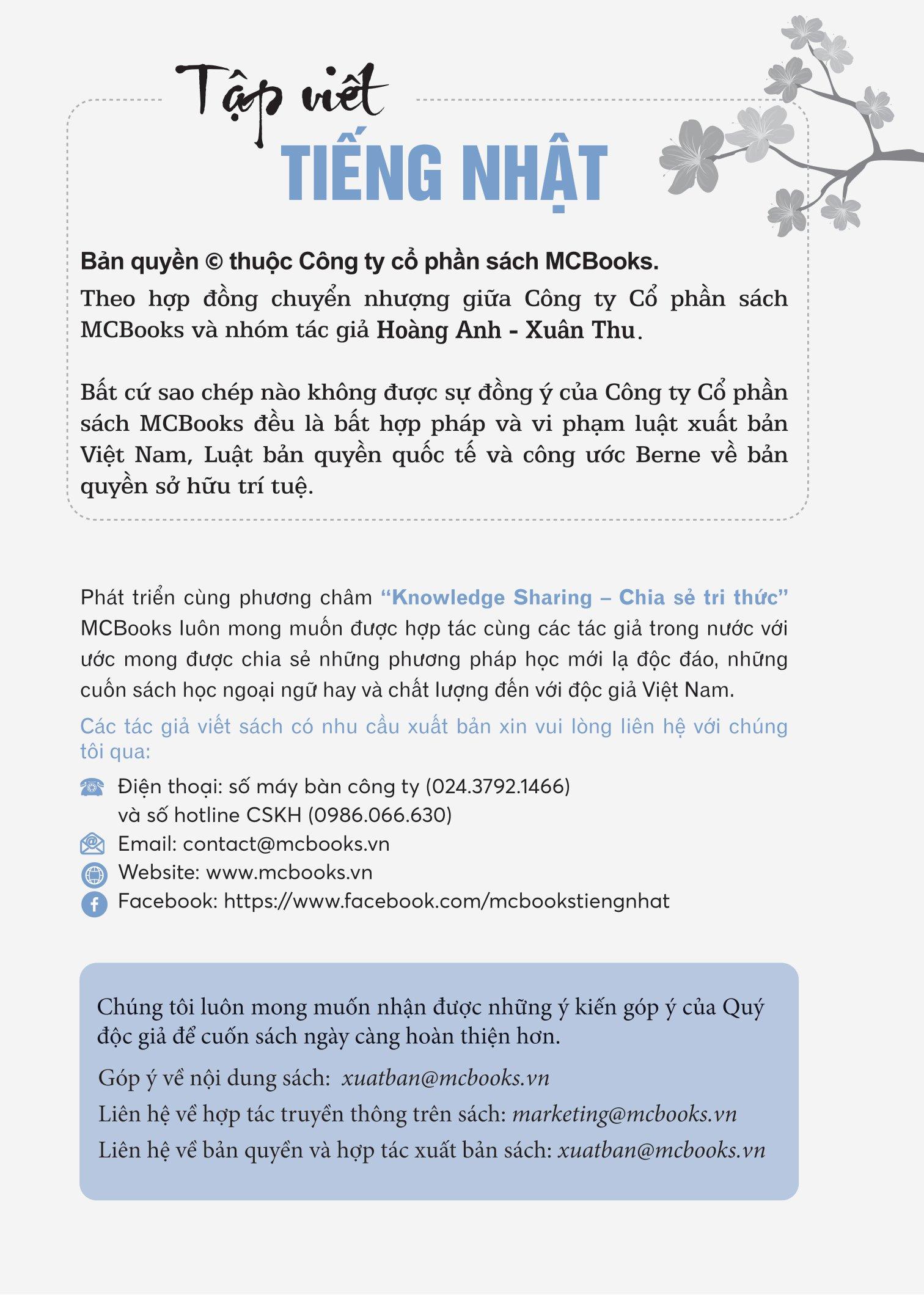 Cuối cùng, hy vọng rằng cuốn sách này sẽ là người bạn đồng hành thân thiết, hỗ trợ đắc lực cho các bạn yêu thích và muốn học tốt tiếng Nhật, giúp cho con đường theo đuổi đam mê của mọi người nhẹ nhàng và trở nên thú vị hơn. Chúc các bạn học tốt