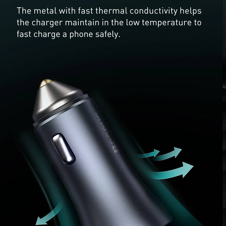 Tẩu củ sạc nhanh 40W đa năng cho xe hơi / xe ô tô trang bị cổng Type-C PD và USB hiệu Baseus Goldern Contactor Pro Tuy thiết kế tổng thể là kim loại nguyên khổi nhưng nó có khả năng tản nhiệt cực tốt giúp quá trình sạc được ổn định và ạn chế tối đa cháy nổ.