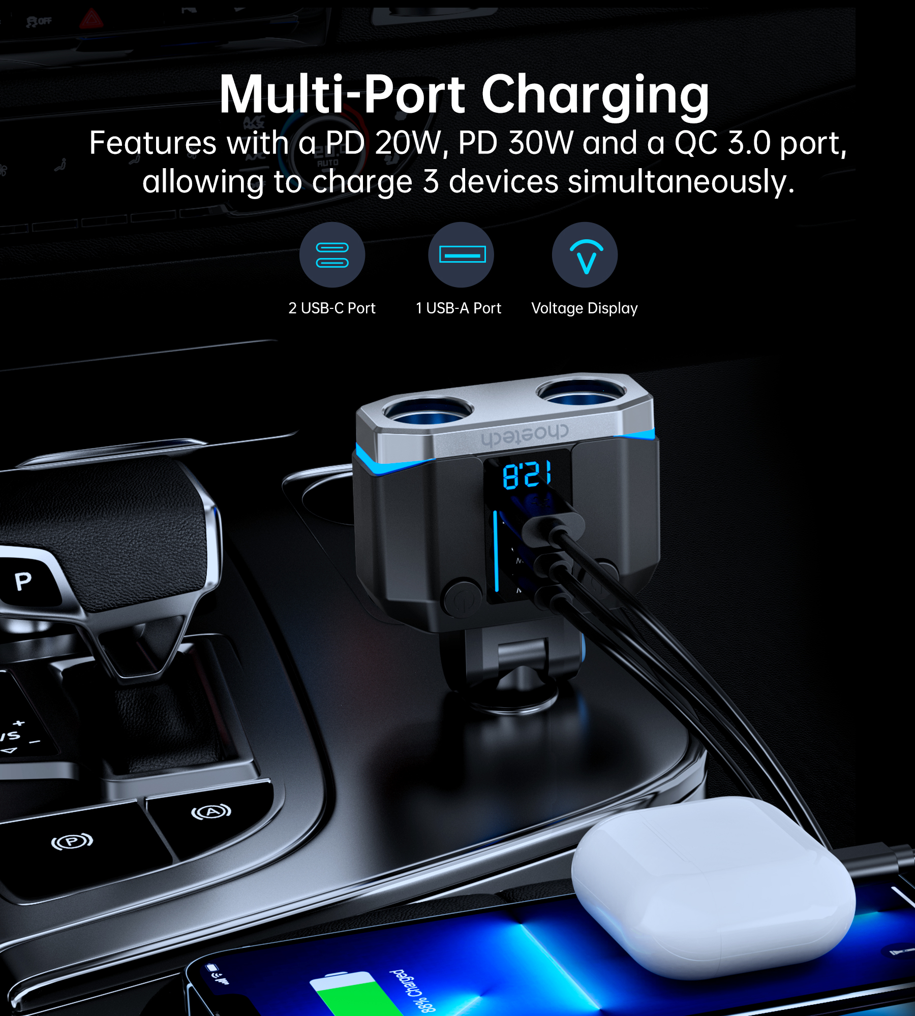 – là một tẩu sạc mở rộng được thiết kế dạng bộ chia hình chữ Y, có thể gấp xoay và có thể điều chỉnh hướng nhiều góc. Để chuyển đổi nguồn điện từ lỗ cắm tẩu điện trên ô tô thành thêm hai lỗ cắm tẩu, 2 cổng sạc Type C và 1 USB.