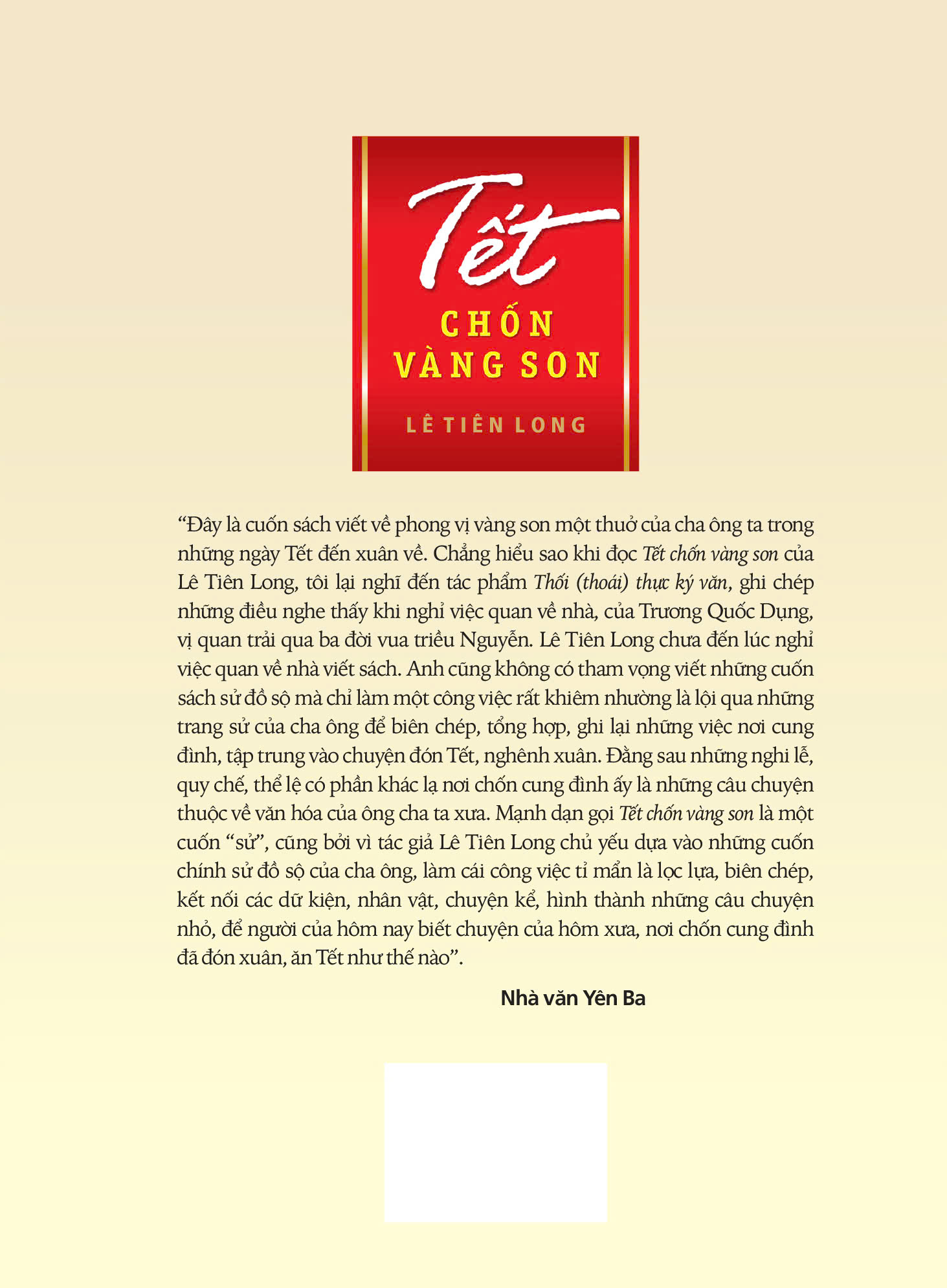 Đây là cuốn sách viết về phong vị vàng son một thuở của cha ông ta trong những ngày Tết đến xuân về. Tác giả Lê Tiên Long chủ yếu dựa vào những cuốn sách chính sử đồ sộ của cha ông, làm cái công việc tỉ mẩn là lọc lựa, biên chép, kết nối các sự kiện, nhân vật, chuyện kể, hình thành những câu chuyện nhỏ, để người của hôm nay biết chuyện của hôm xưa, nơi chốn cung đình đã đón xuân, ăn Tết như thế nào. Chỉ có điều nó không phải một cuốn sử theo nghĩa thông thường, mà mang cái phong vị dân dã, khiêm cung, dẫu viết chủ yếu về những nghi lễ rắc rối phức tạp ở nơi chốn uy nghiêm, sang trọng bậc nhất trong thời kỳ phong kiến là cung đình!