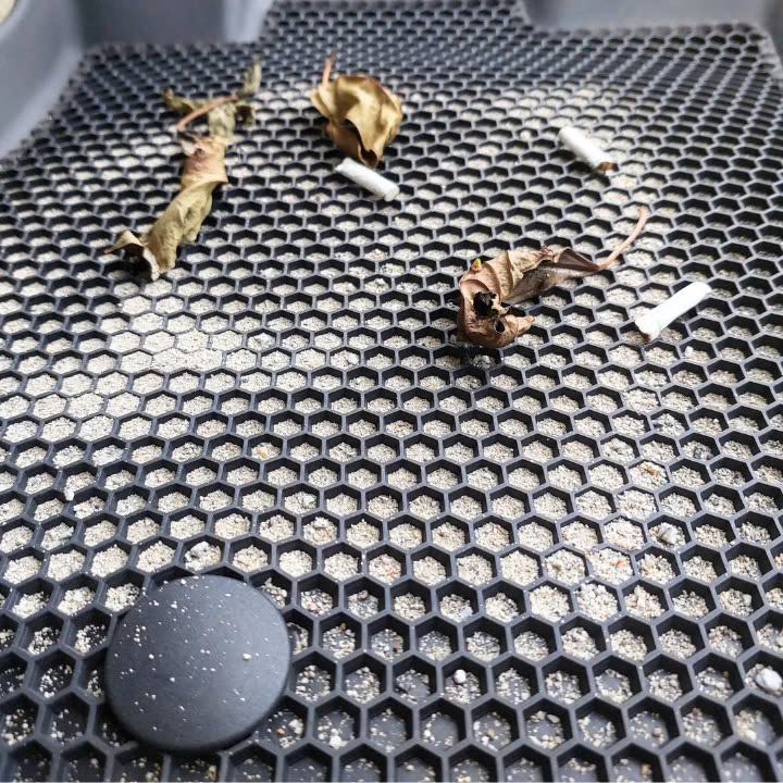 Lớp 2: Thảm dạng lưới lục giác giấu bụi bằng cao su PBR (Polybutadiene Rubber): Chất liệu cao su PBR dẻo dai, độ đàn hồi cao, chống mài mòn cực tốt, không mùi, thân thiện với môi trường và sức khỏe. Thiết kế dạng lưới lục giác 3D thông minh giúp giấu bụi, giữ lại rác và đất cát mà không bị lộ ra ngoài. Khả năng bám sàn tốt, giúp thảm không bị xô lệch khi sử dụng. Có thể tháo rời dễ dàng để vệ sinh riêng, giữ cho lớp dưới luôn sạch sẽ.