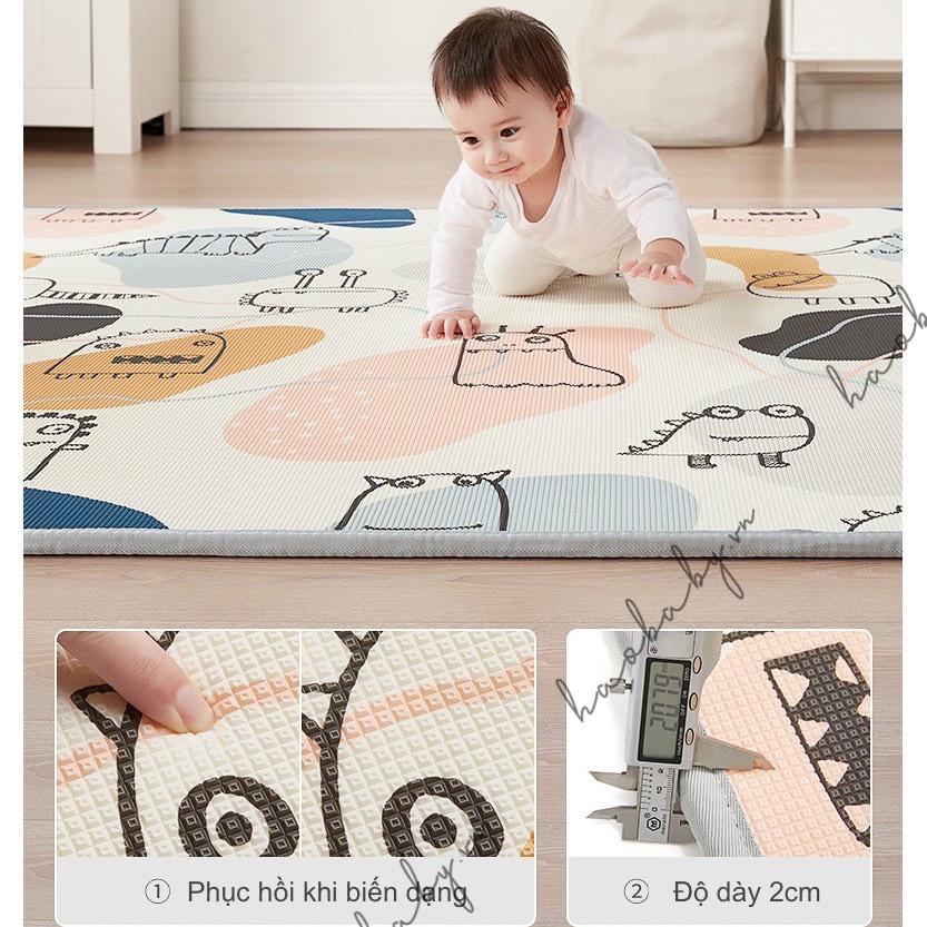 - Kích thước 1m4x1m8x1.5 cm. Ưu điểm Phải nói là dòng thảm tuyệt vời dành cho các Bé mà 100% các Mẹ nhận hàng và sử dụng đều hài lòng về chất lượng Chống thấm nước nên 2 vợ chồng nhàn hẳn ra, Bé có lỡ vệ sinh ra thảm chỉ cần dùng khăn lau là sạch luôn ý. Thảm có độ mềm,êm và đàn hồi vượt trội, cực an toàn khi bé vận dộng, vui chơi trên thảm. Độ bền cực cao gấp 5 lần thảm xốp thông thường. Không mùi (cả trước và sau khi sử dụng),không có mùi nhựa,mùi xốp như các chất liệu rẻ tiền khác). Không chứa thành phần độc hại đáp ứng tiêu chuẩn đảm bảo sử dụng an toàn cho trẻ sơ sinh và trẻ nhỏ. Bề mặt thảm xốp có vân nổi chống trơn trượt. Thảm có 2 mặt với 2 hình khác nhau,thỉnh thoảng thay đổi cho mới. Thảm có hình thù họa tiết màu sắc đáng yêu bé sẽ vô cùng thích thú. Có thể gấp gọn mang đi khắp mọi nơi,cất gọn không tốn diện tích luôn ạ. Chất liệu Chất liệu xốp XPE không mùi. An toàn tuyệt đối.