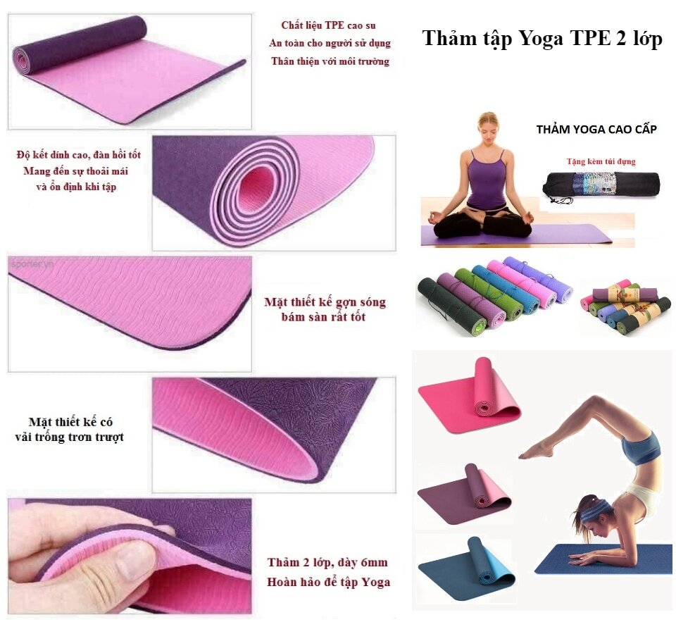 - Thảm Tập Gym Và Yoga 2 Lớp TPE Eco (6mm) là người bạn đồng hành cùng người tập Yoga với độ dày 6mm. - Mặt dưới có độ bán dính và bám sàn cao,