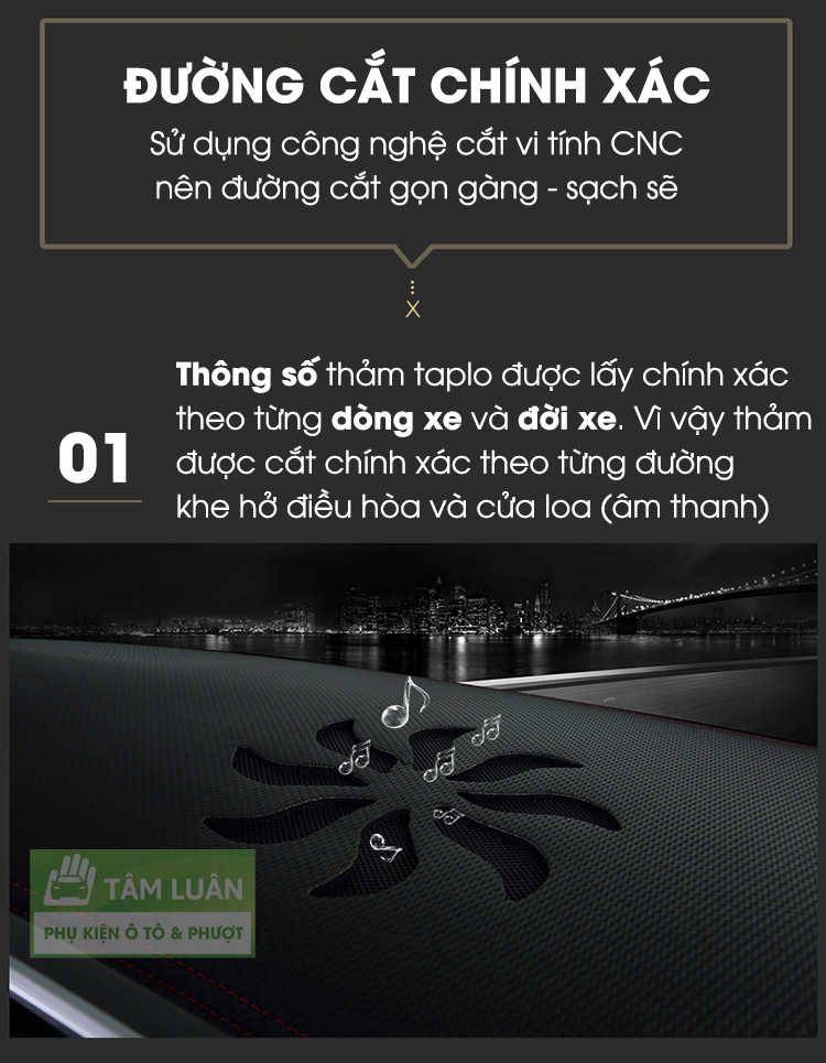 Mua tại TiktokThảm taplo ô tô da carbon Tâm Luân được sản xuất trên dây truyền cộng nghệ cao, cắt với máy tính và lưỡi cắt CNC chính xác đến từng mm. Hiện thảm taplp carbon của chúng tôi có các mẫu dùng cho xe như sau: vinfast fadil, vinfast lux a, toyota vios, toyota veloz, toyota fortuner, toyota cross, kia morning, kia cerato, kia k3, kia soluto, kia seltos, kia carnival, kia sonet, hyundai grand i10, hyundai accent, hyundai santafe, hyundai tucson, hyundai kona, honda crv, honda vivic, honda city, suzuki xl7, mazda cx5, mazda 3, ford ranger, mitsubishi xpander, mitsubishi attrage