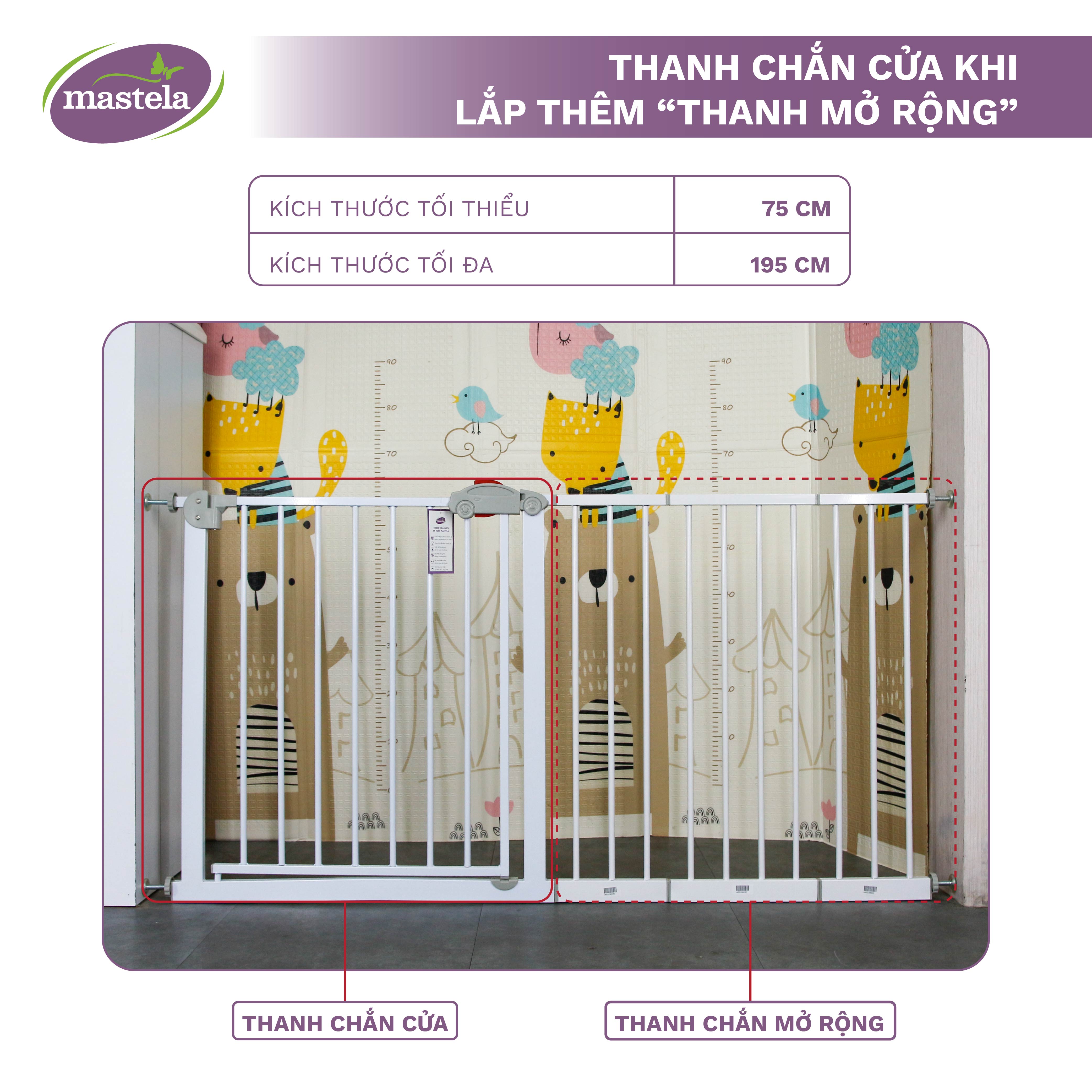 - Bảo hành chính hãng: 12 tháng CÔNG DỤNG SẢN PHẨM Giúp bé vui chơi trong khu vực an toàn. Thanh chắn cửa, chắn cầu thang Mastela giúp bố mẹ tạo ra một không gian chơi đùa an toàn cho con mà không cần lo lắng. Sử dụng cho các cửa có chiều rộng từ 75-85cm, chiều cao 76cm. Hoặc có thể nối thêm thanh cửa mở rộng nếu cửa to hơn ƯU ĐIỂM SẢN PHẨM