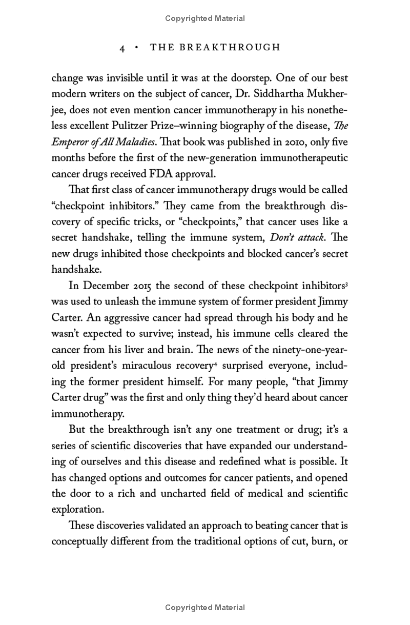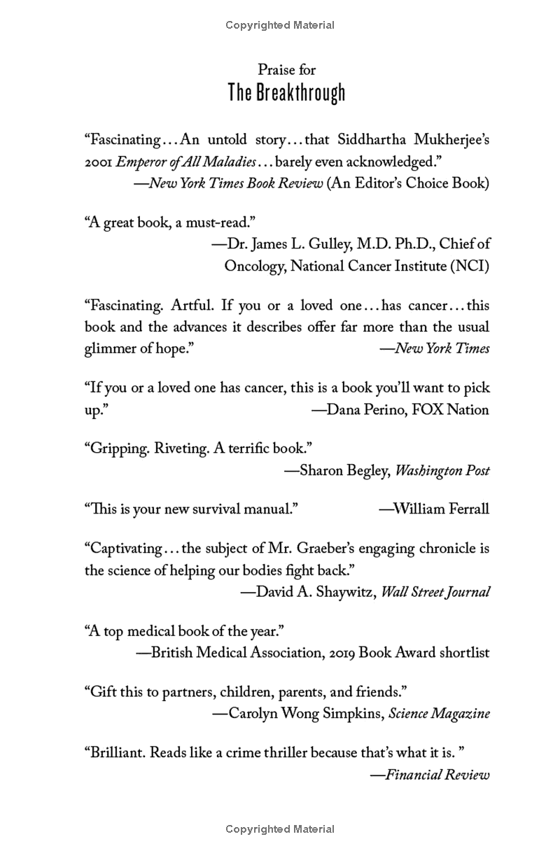 Groundbreaking, riveting, and expertly told, The Breakthrough is the story of the game-changing scientific discoveries that unleash our natural ability to recognize and defeat cancer, as told through the experiences of the patients, physicians, and cancer immunotherapy researchers who are on the front lines. This is the incredible true story of the race to find a cure, a dispatch from the life-changing world of modern oncological science, and a brave new chapter in medical history.