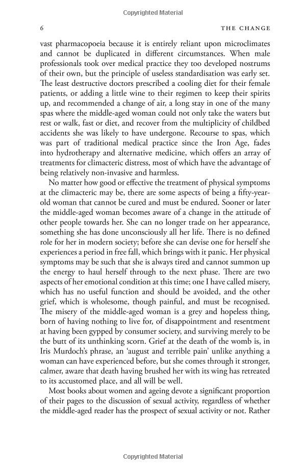 Now more than ever, amid the clamour of online chatrooms and promotions for a vast array of alternative therapies, the individual woman has to manage her passage through menopause for herself. In The Change, Germaine Greer provides a common-sense guide to a very interesting and important stage of women's lives.