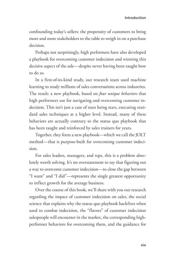 In sales, the worst thing you can hear from a customer isn't 'no.' It's 'I need to think about it.' When this happens, deeply entrenched business advice says to double down on your efforts to sell a buyer on all the ways they might win by choosing you and your business. But this approach backfires dramatically. Why? Because it completely gets wrong the primary driver behind purchasing decision-making: once purchase intent is established, customers no longer care about succeeding. What they really care about is not failing. For years, sales expert Matthew Dixon has been busting longstanding business myths. Now in The JOLT Effect, he and co-author Ted McKenna turn their trademark analysis and latest research to the vital and growing problem of customer indecision - and offer a shocking new approach that turns conventional wisdom on its head. Drawing on a brand-new, first-of-its-kind study of more than two and a half million sales conversations from across industry, they reveal the surprising truth that high-performing sales reps grasp and their average-performing peers don't: only by sing the customer s fear of failure can you get indecisive buyers to go from verbally committing to actually pulling the trigger. Packed with robust data, counterintuitive insights, and practical guidance, The JOLT Effect is the playbook for any salesperson or sales leader who wants to close the gap between customer intent and action - and close more sales.