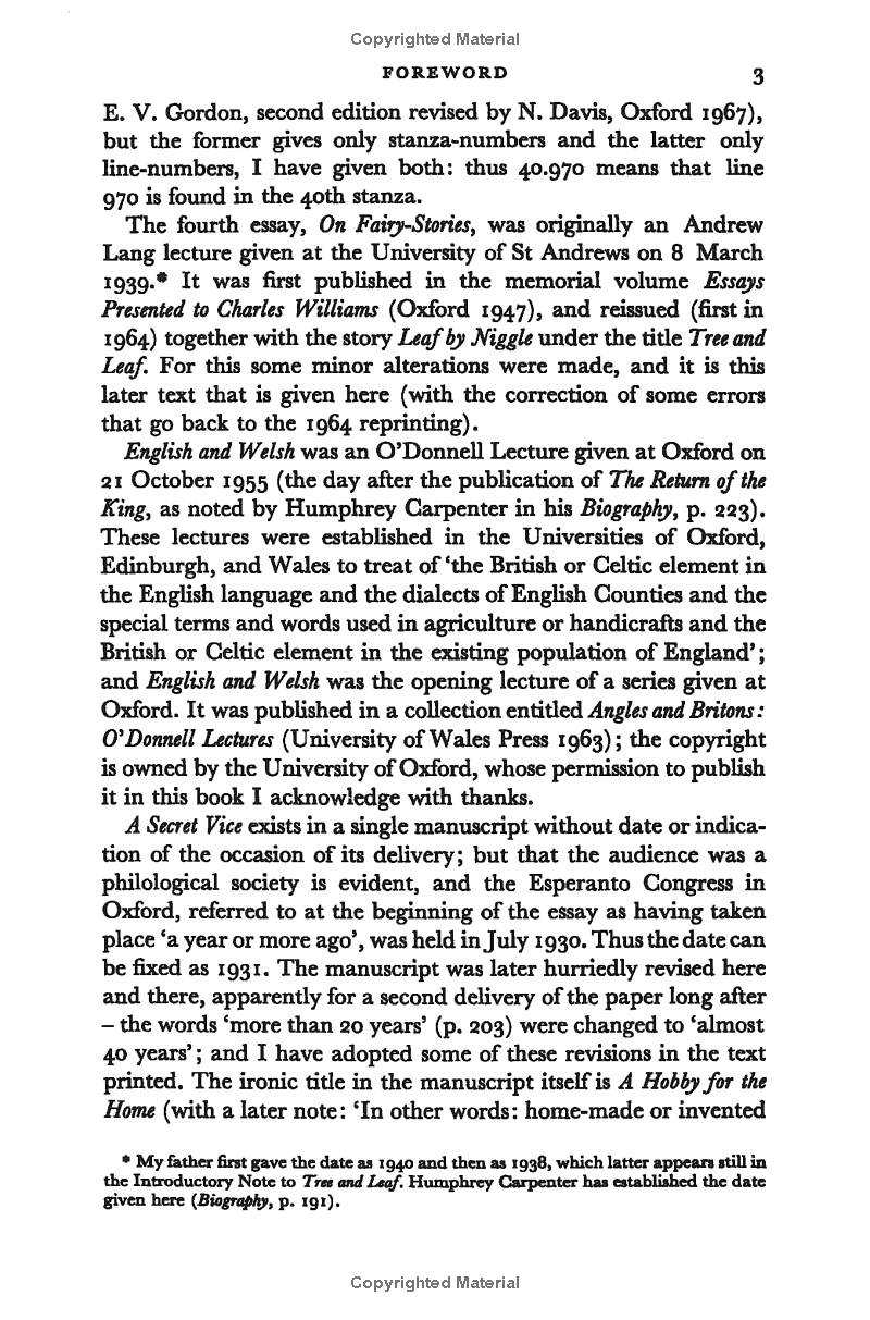 The pieces in this collection cover a period of nearly thirty years, beginning six years before the publication of The Hobbit, with a unique 'academic' lecture on his invention (calling it A Secret Vice) and concluding with his farewell to professorship, five years after the publication of The Lord of the Rings.