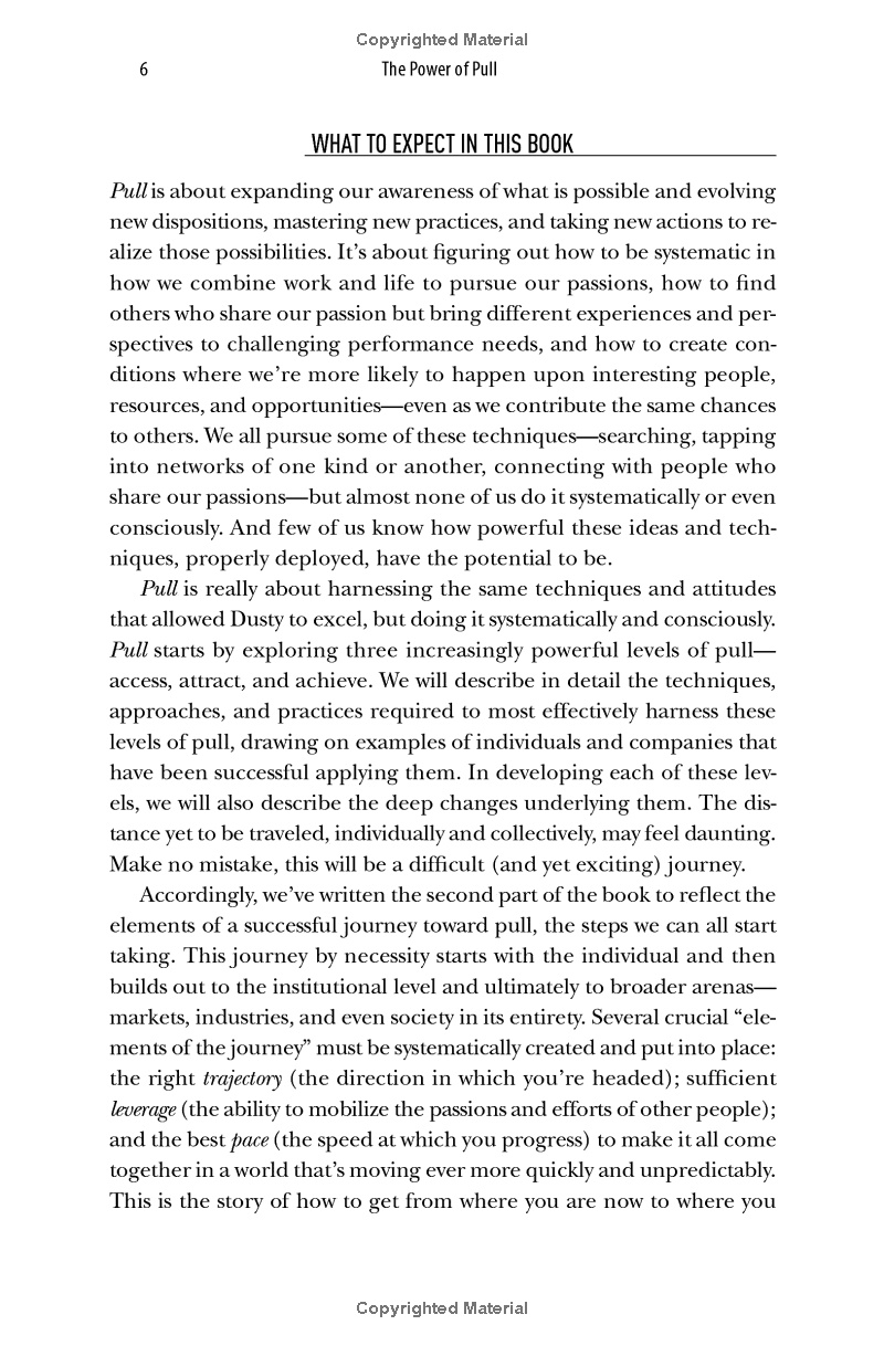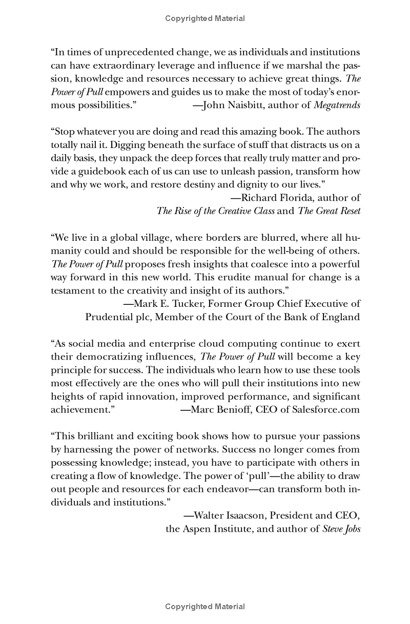 In a radical break with the past, information now flows like water, and we must learn how to tap into its stream. Individuals and companies can no longer rely on the stocks of knowledge that they've carefully built up and stored away. Information now flows like water, and we must learn how to tap into the stream. But many of us remain stuck in old practices- practices that could undermine us as we search for success and meaning. In this revolutionary book, three doyens of the Internet age, whose path-breaking work has made headlines around the world, reveal the adjustments we must make if we take these changes seriously. In a world of increasing risk and opportunity, we must understand the importance of pull . Understood and used properly, the power of pull can draw out the best in people and institutions by connecting them in ways that increase understanding and effectiveness. Pull can turn uncertainty into opportunity, and enable small moves to achieve outsized impact. Drawing on pioneering research, The Power of Pull shows how to apply its principles to unlock the hidden potential of individuals and organizations, and how to use it as a force for social change and the development of creative talent. The authors explore how to use the power of pull to: Access new sources of information Attract likeminded individuals from around the world Shape serendipity to increase the likelihood of positive chance encounters Form creation spaces to drive you and your colleagues to new heights Transform your organization to adapt to the flow of knowledge The Power of Pull is essential reading for entrepreneurs, managers, and anybody interested in understanding and harnessing the shifting forces of our networked world.