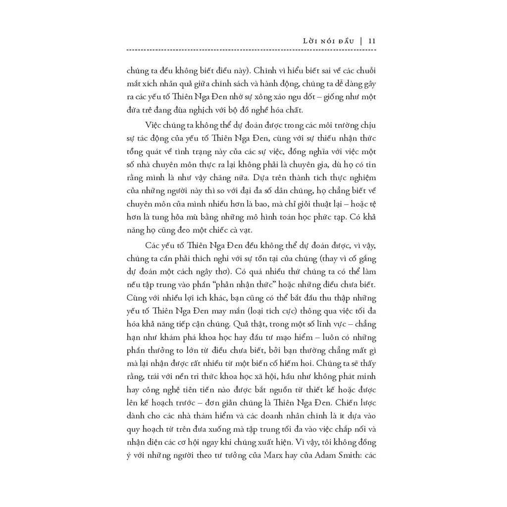Thiên Nga Đen Trước khi khám phá ra thiên nga đen tồn tại trên đời (ở Úc), người ta vẫn tin rằng tất cả chim thiên nga trên đời đều có màu trắng. Phát hiện bất ngờ này đã thay đổi toàn bộ thế giới quan của nhân loại (về thiên nga). Chúng ta không biết rất nhiều thứ nhưng lại hành động như thể mình có khả năng dự đoán được mọi điều. Và trong cuốn sách này, tác giả Nassim Nicholas Taleb đã đi sâu vào khai thác những sai lầm của tư tưởng cố hữu ấy. Theo ông, “thiên nga đen” là một biến cố tưởng chừng như không thể xảy ra với ba đặc điểm chính: không thể dự đoán, có tác động nặng nề và sau khi nó xảy ra, người ta lại dựng lên một lời giải thích để khiến nó trở nên ít ngẫu nhiên hơn, dễ dự đoán hơn so với bản chất thật của nó. Thành công đáng kinh ngạc của Fb có thể được coi là một “thiên nga đen”, việc nước Anh rời khỏi Liên minh châu u cũng là một “thiên nga đen”. Thiên nga đen luôn ẩn hiện trong mọi mặt của cuộc sống với những tác động khó lường, theo cả hướng tiêu cực và tích cực. Tinh tế, táo bạo nhưng không kém phần thú vị, Thiên Nga Đen chắc chắn là cuốn sách không thể bỏ qua cho những ai đam mê hiểu biết. Và cuốn sách này, bản thân nó cũng chính là một thiên nga đen…