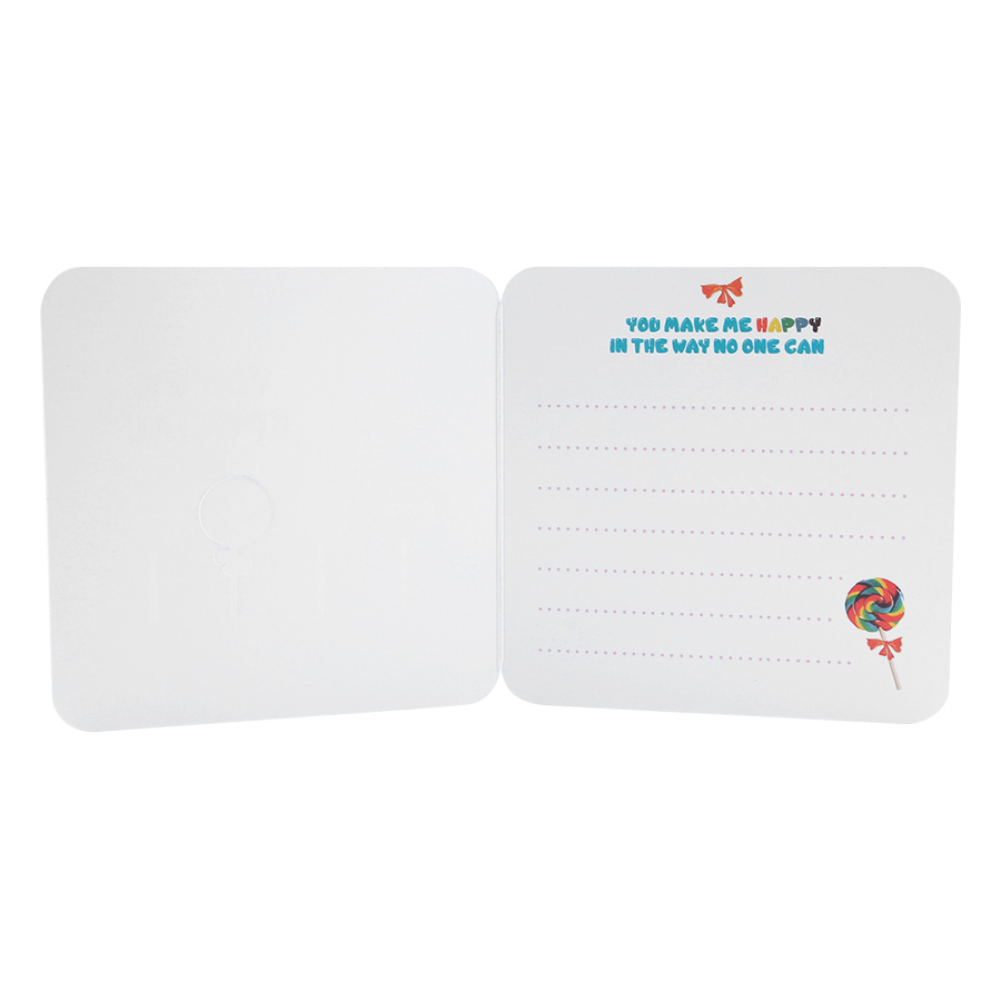 - Chất liệu giấy cao cấp, trơn mịn Thiết kế bên trong viết nội dung có in hình ảnh xinh xắn Họa tiết trang trí đơn giản, màu sắc bắt mắt Là quà tặng dễ