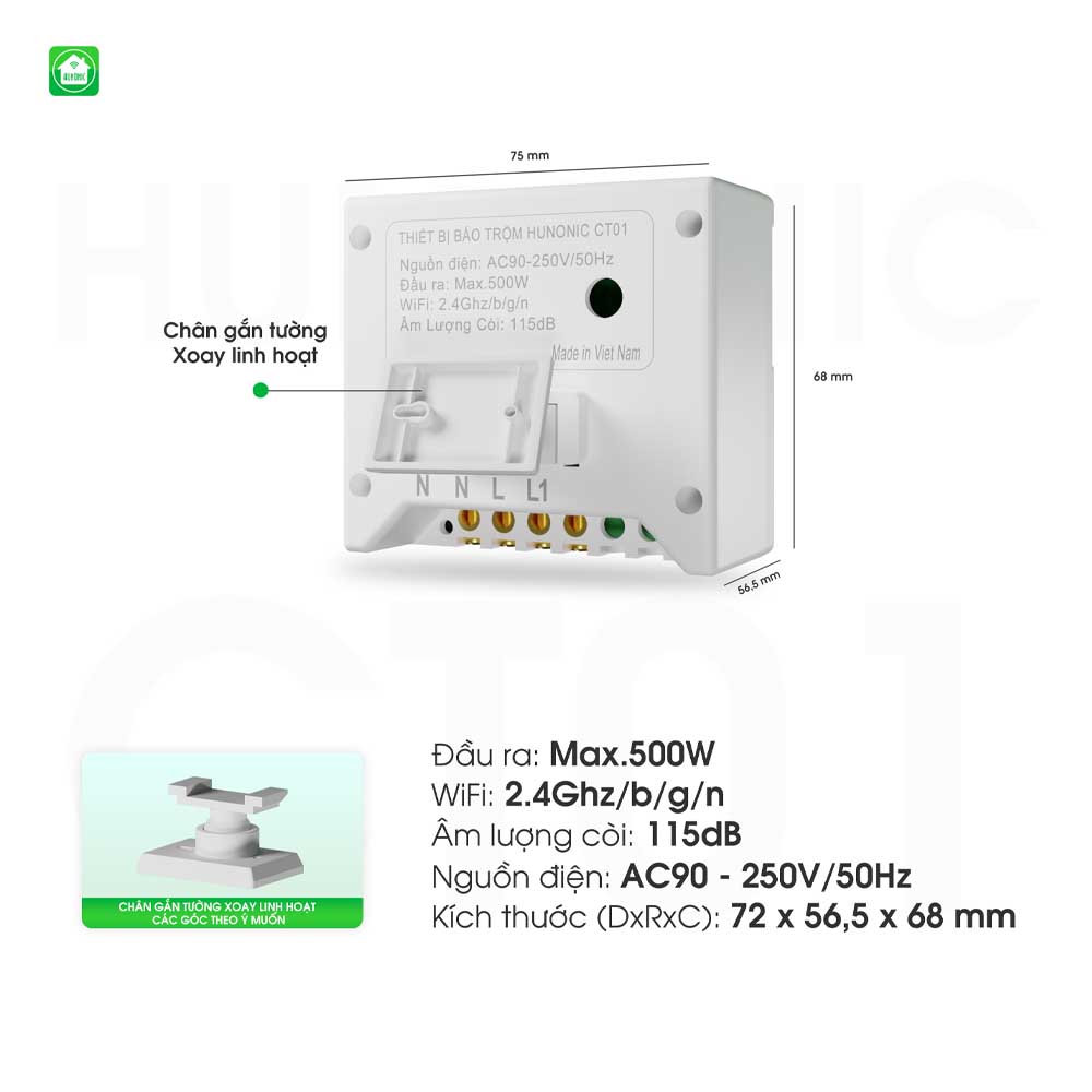 - Không cần trang bị Hub trung tâm. Wifi: 2.4 ghz b/g/n. Âm lượng còi 115dB. Nguồn điện AC90 – 250V/50Hz. Trong thời đại công nghệ hiện nay, cuộc sống đã trở nên tiện lợi hơn bao giờ hết với sự phát triển của smart home và các thiết bị thông minh. Tuy nhiên, cùng với những tiện ích đó cũng có những rủi ro về an ninh và trộm cắp ngày càng trở nên nguy hiểm hơn, khiến cho việc bảo vệ tài sản và an toàn cho người thân trở thành mối quan tâm hàng đầu của nhiều gia đình. Là một nhà phát triển về thiết bị nhà thông minh, Hunonic không thể bỏ qua giải pháp thiết thực và cấp thiết hiện nay là an ninh thông minh, từ đó các kĩ sư Hunonic đã nghiên cứu và cho ra đời sản phẩm Thiết bị chống trộm CT01. Thiết kế nhỏ gọn, an toàn Thiết bị chống trộm Hunonic CT01 có thiết kế nhỏ gọn không chiếm nhiều diện tích, vì vậy người dùng có thể đặt ở đâu mà họ muốn. Ngoài ra, được làm từ nhựa ABS cao cấp nên thiết bị khá an toàn và bền đối với người dùng. Tính năng của thiết bị chống trộm CT01 Tính năng báo trộm – còi cảnh báo Tính năng phát hiện chuyển động – báo về điện thoại Đế xoay linh hoạt – tuỳ chỉnh góc quét phạm vi rộng Tính năng tổ liên gia – hiệp lực chống trộm Tính năng chuông báo khách Thông số kĩ thuật Đầu ra: MAX.500W Wifi: 2.4 ghz b/g/n Âm lượng còi 115dB Nguồn điện AC90 – 250V/50Hz