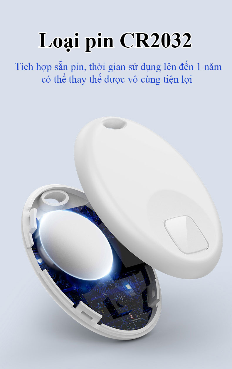 Thiết bị sử dụng pin cúc áo, rất tiện lợi, có thể dùng 6 -12 tháng mới phải thay. Thiết bị không cần sim, định vị thông qua các thiết bị Apple ở xung quanh.