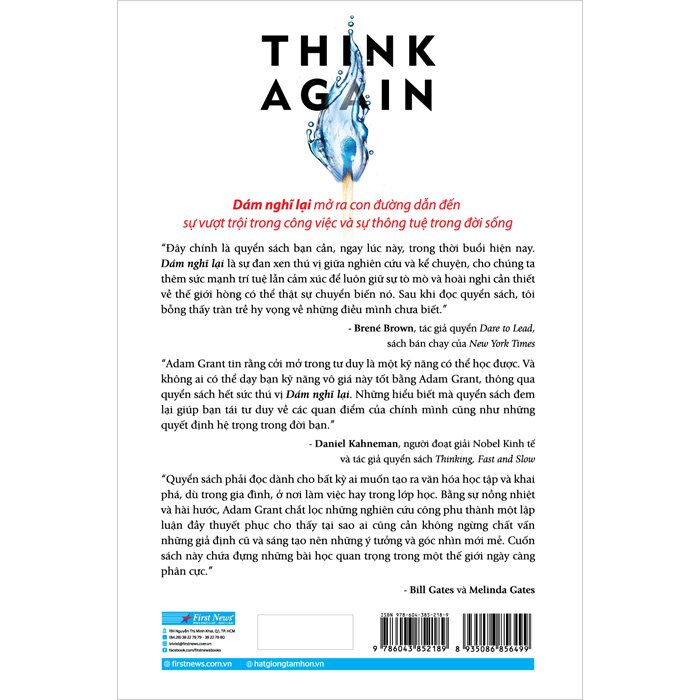 "Đây là cuốn sách phải đọc với bất kỳ ai muốn tạo ra văn hóa học hỏi và khám phá, cho dù ở nhà, ở cơ quan hay ở trường học. Bằng sự nồng nhiệt và hài hước, Adam Grant đã chắt lọc những nghiên cứu công phu thành một lập luận đầy thuyết phục cho thấy tại sao ai cũng cần không ngừng chất vấn những giả định cũ và sáng tạo nên những ý tưởng và góc nhìn mới mẻ. Cuốn sách này chứa đựng những bài học quan trọng trong một thế giới ngày càng phân cực.” - Bill and Melinda Gates